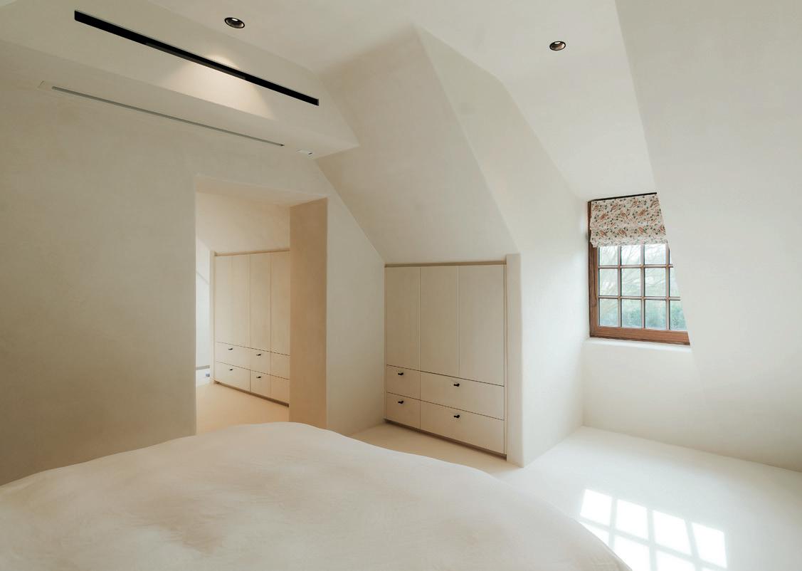 De eerste verdieping ademt rust, soberheid en warmte. In de badkamers zorgen het afgeronde meubel in donkerbruin gebeitst eikfineer en de inloopdouche met indirecte verlichting en ingewerkte nis voor een plek om heerlijk te ontwaken of te ontspannen na een drukke dag. Ook in de slaapkamers en de wasplaats werd maximaal ingezet op comfort en functionaliteit. Onder het schuine dak werden slimme opbergruimtes gecreëerd met extra diepe lades, perfect afgestemd op het dagelijks gebruik.