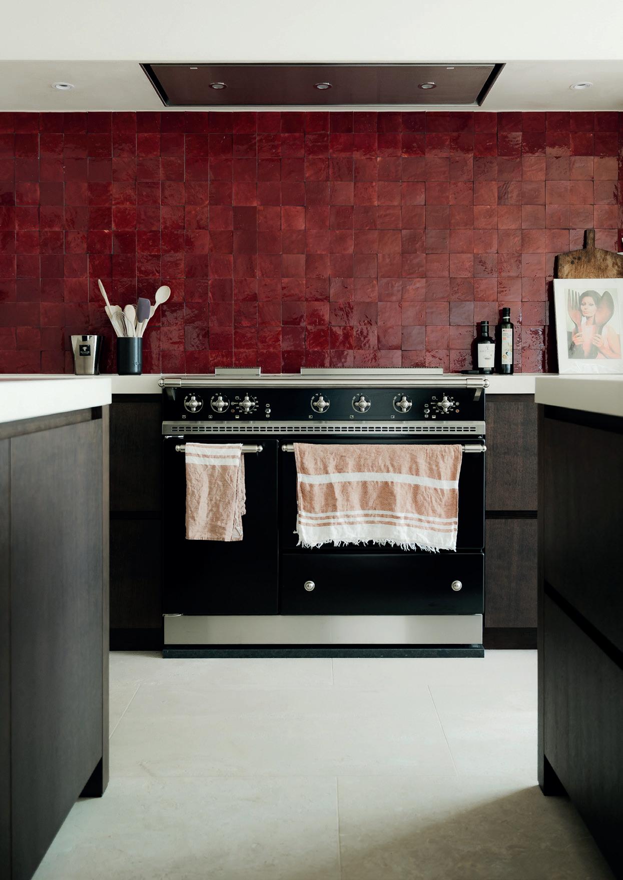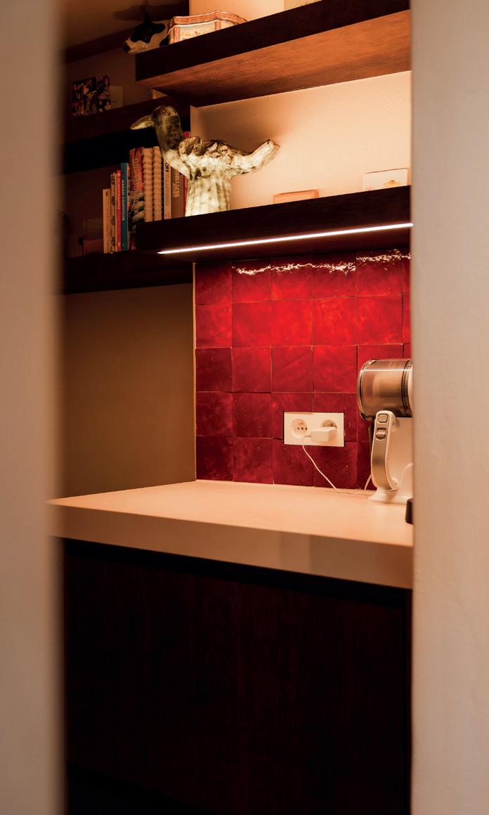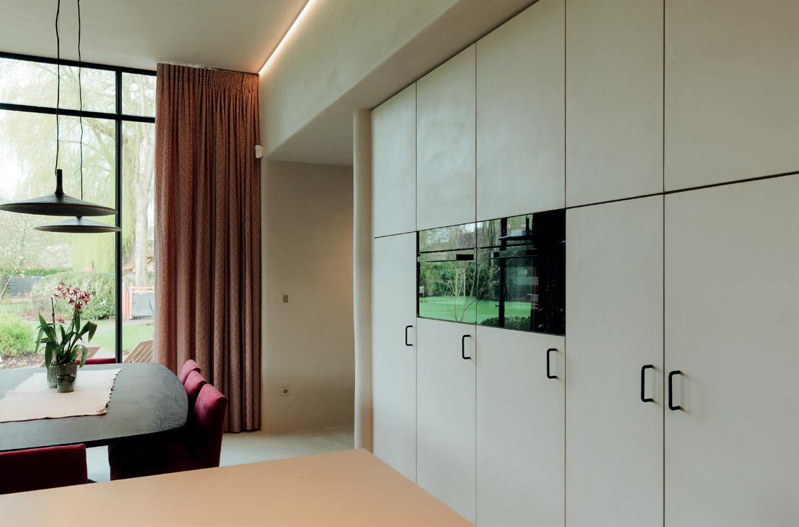 De keuken vormt het warme hart van de woning en weerspiegelt perfect de leefstijl van de familie. Natuurlijke materialen en rijke texturen zorgen voor een uitnodigende sfeer, met als blikvanger het robuuste Lacanche fornuis. Donker gebeitst eikfineer, ambachtelijke zellige tegels in bordeauxrood en een composiet werkblad in zachte zandtint worden verfijnd aangevuld met details zoals een messing patina Quooker kraan, speelse indirecte verlichting in de schabben en een gezellige coffeecorner. De microtopping op de hoge kasten keert subtiel terug doorheen de hele woning en versterkt het gevoel van eenheid.