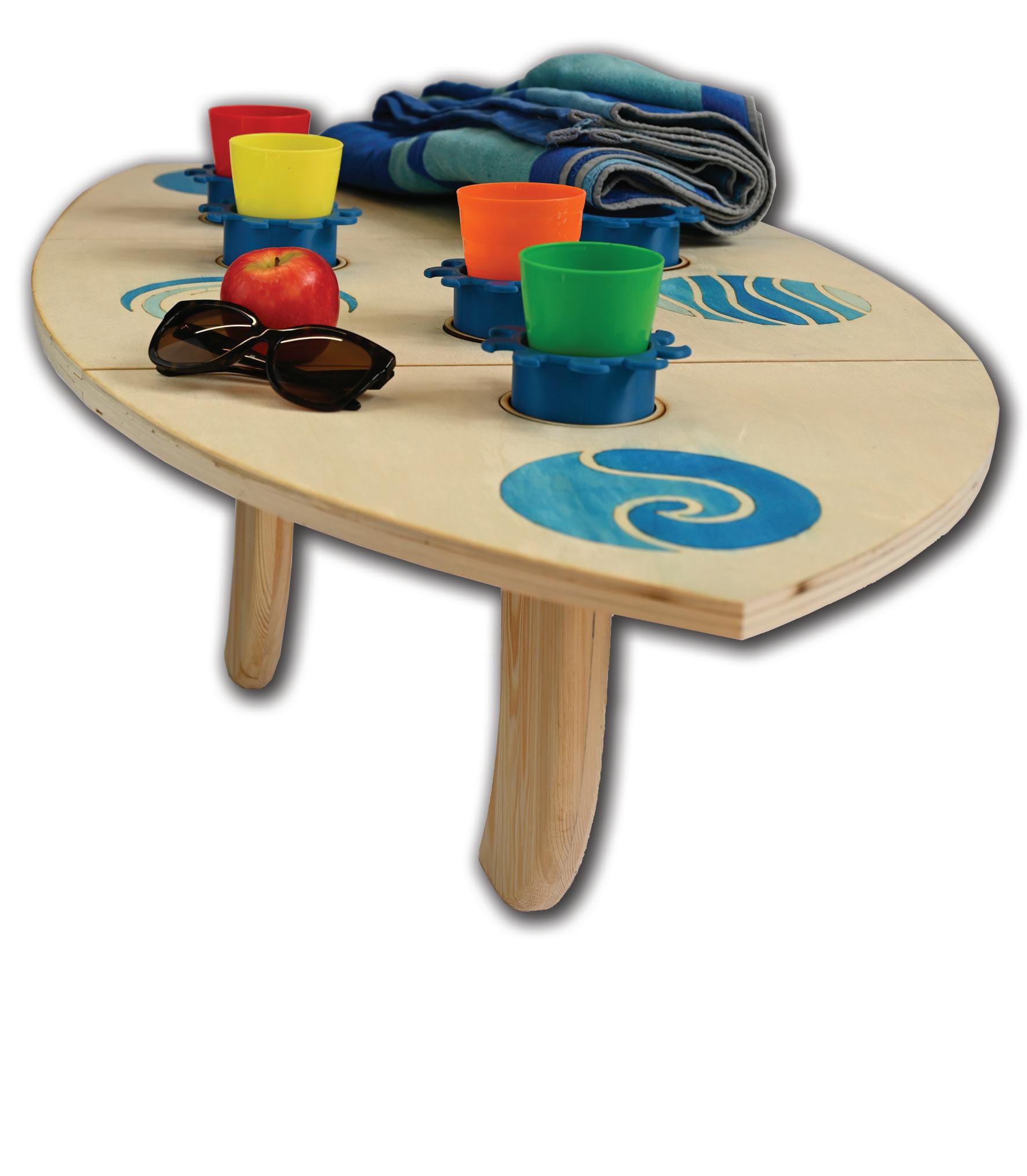 I made a travel table that folds up into a bag. My inspiration was from a surfboard and the beach, I made the table the shape of a surfboard and included blue cup holders with waves on, to match the theme. I explored into eating outdoors and the problems and opportunities that occur. I then focused within eating on the beach and focused on the aesthetics of the table to ensure that it was visually fun to look at. I really enjoyed the making process and am pleased with my outcome.