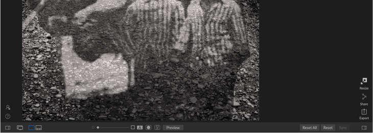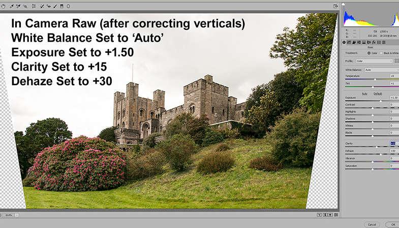 Stage 2 . To recover brightness, colour and detail the image is opened into `Camera Raw’ (Ctrl+Shift+A). Settings in Camera Raw will depend on each individual image, however the settings used for this image were: White Balance to Auto, Exposure to +1.50, Clarity to +15, and Dehaze to +30. At this stage we only need to get something quite close to the colour and brightness required as these may be ne-tuned later using adjustment layers.