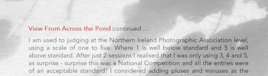 For those who are interested, “The objects of The Society are to educate members of the public by increasing their knowledge and understanding of Photography and in doing so, to promote the highest standards of achievement in Photography in order to encourage public appreciation of Photography.” Mention is not made of any bene t to paying members, nor of the unstinting contribution of the multitude of volunteers who run most of the activities of the Society.