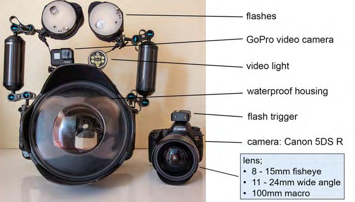 I use a Canon 5DS R in a Nauticam underwater housing. Really important additions are the two powerful strobes (flashes) that restore the colour back into the underwater scene. Water filters out colour from sunlight and the deeper you go the more colours disappear, that’s why many underwater images appear grey and colourless. The colour is there but the camera cannot record it. The strobes bring artificial sunlight and restore colour. Getting sufficient light on your subject is challenging, but the angle of the light is also important if you want to show all the glorious details. Flat light does not show them off at their bestbut this is when being underwater