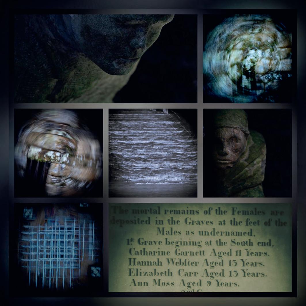 I began by visiting the memorial to the children in Silkstone Common on a March afternoon when I was able to photograph the two sculptures that represent the children. I added some extra light onto their faces to represent the glimmer of a candle in the dark. in order to create images to represent the tunnel with the water flowing through I visited nearby Worsbrough Mill and used a combination of in-camera multiple exposure while turning the camera round to represent the tunnel. I then took photographs of a barred window to represent the ventilation door that actually trapped them when the water came rushing along the usually dry stream bed. None of these images were made in Photoshop - they were all incamera.