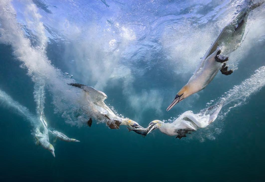 After observing them from the cliff tops, I decided that to photograph them underwater, as they made their headlong dive to capture fish, would be a real challenge - but one worth pursuing. I went to Shetland to try this because the water is much clearer there. However, it is also very cold - around 10° Celsius - so I had to wear a thermal diving suit. I used a local tour boat to take me to the gannet colony at Noss Point and, on arrival, the gannets gathered in their hundreds around the boat. When I first went under I was concerned about getting hit by one of them, but I quickly saw that they are far too agile for that. After all, they always avoid hitting each other - and I am a much bigger target to avoid.