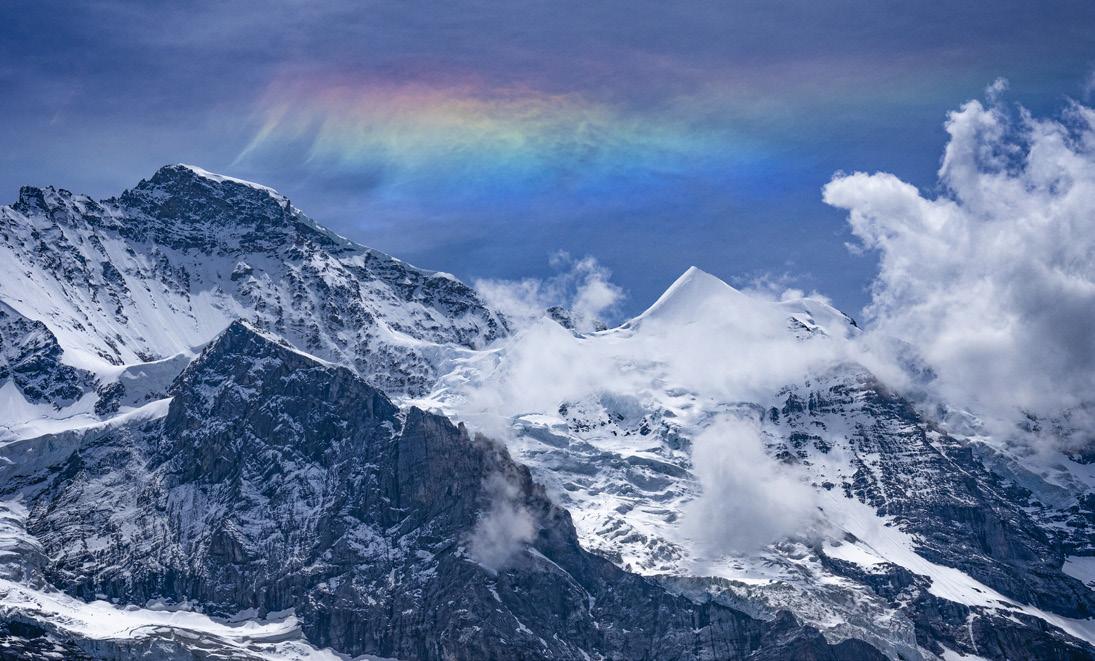 The Ice Crystal Rainbow over the Silberhorn (3695 m) in the Bernese Alps is created when ice crystals act as a prism and by the refraction of the sunlight create a coloured circumhorizontal arc. They form high in the atmosphere and are relatively rare, so I was pleased to capture this phenomenon.