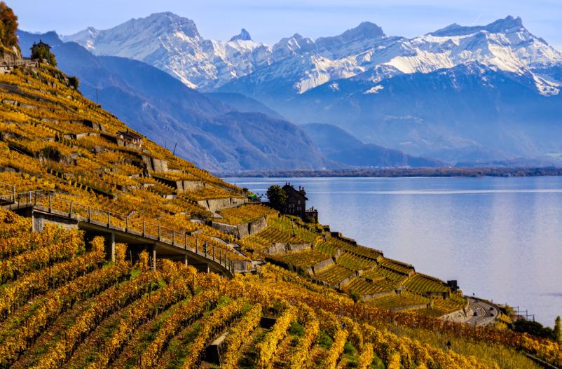 The area between Vevey and Lausanne is part of the UNESCO World Heritage site. The Lavaux Vineyard Terraces, as the name suggests, are full of vineyards stretching along the shores and slopes above Lac Leman. The present terraces date back to the 11th century. The photo Vineyards, Lake and Mountains was taken in the autumn as the leaves from the vines started to turn to yellow, whilst in the distance early snow can be seen on the mountains.