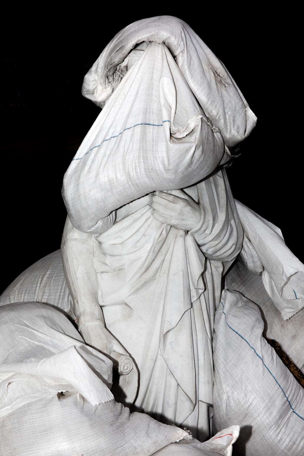 The destruction of artworks in times of war is a brutal and unsettling attack on citizens and cultural legacy. It makes people's histories difficult to understand and even more difficult to remember and appreciate. Here, a sculpture of Dante is draped in its marble form with the edge of his robe gathered in one hand and a scroll in the other. Sandbags now buffer the statue forming additional layers draped across his face and around his feet. The threads of the sacks run into the seams of the robe becoming a brief part of the history of the sculpture. Heritage shows us what it looks like to preserve art and culture at a time of oppression and aggression and how to hope for a more peaceful future.
