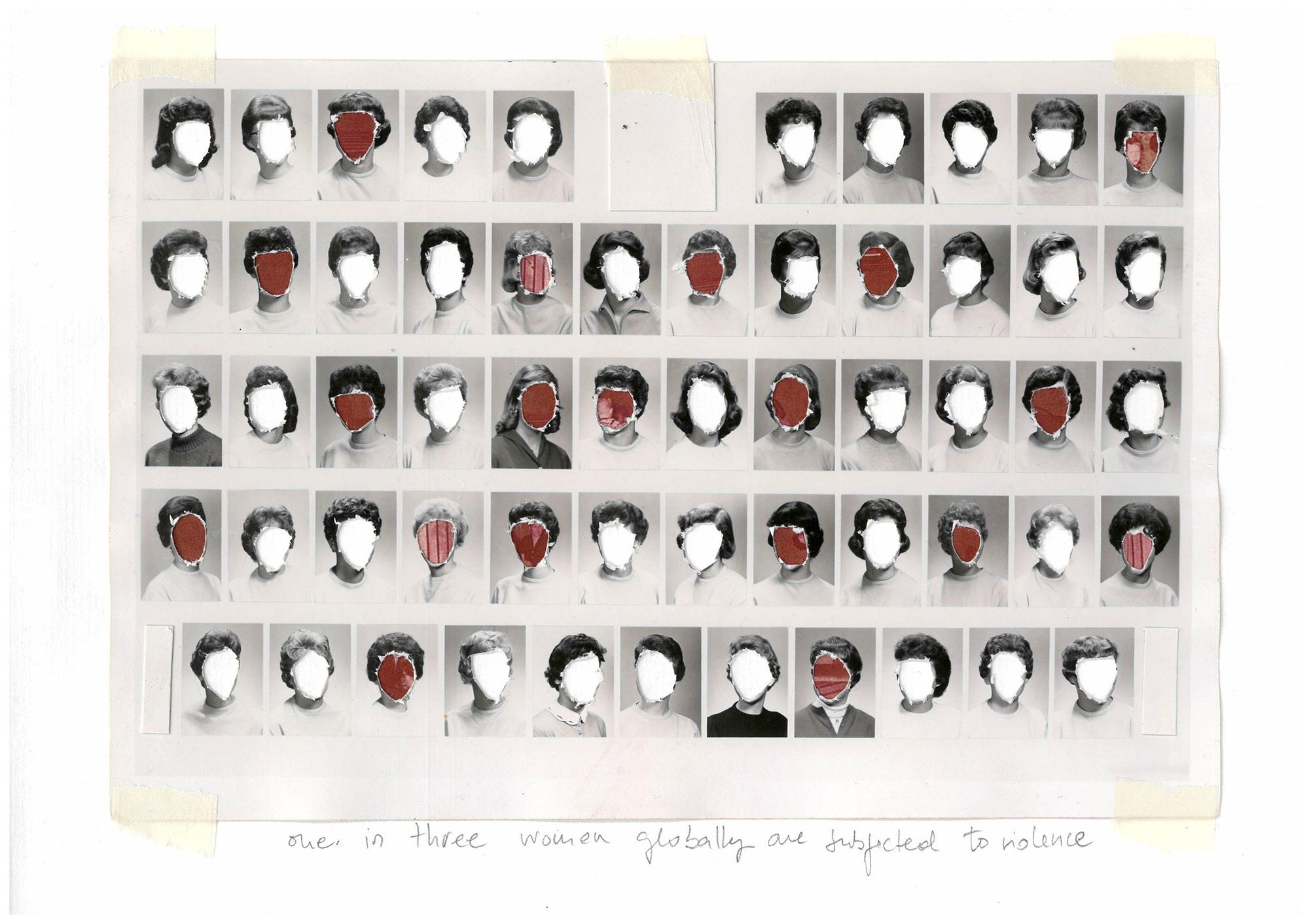 One in Three Women is a fragmented visual, textual and cinematic assemblage which unfolds the subject of gender violence over different panels. The visuals represent the tension between the increasing visibility of violence against women and girls in general and the persistent invisibility of such abuse in everyday life. In addition, the project addresses wider gender issues such as the male gaze, and power dynamics within society.