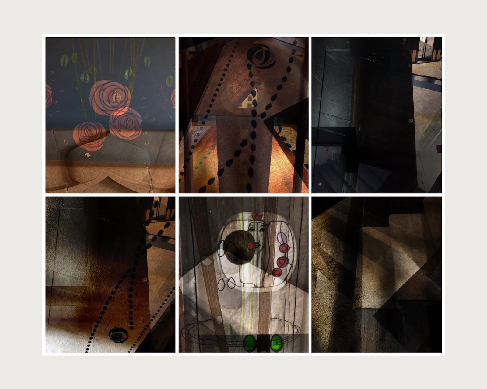 which showcases the work of Charles Rennie Mackintosh. The images on the right were taken using my camera and include some of my favourite Mackintosh designs. The panel was then put together using an app called In-Collage. The six panel on the left is a set I photographed using my iPhone7 with an app called PhotoSplit.