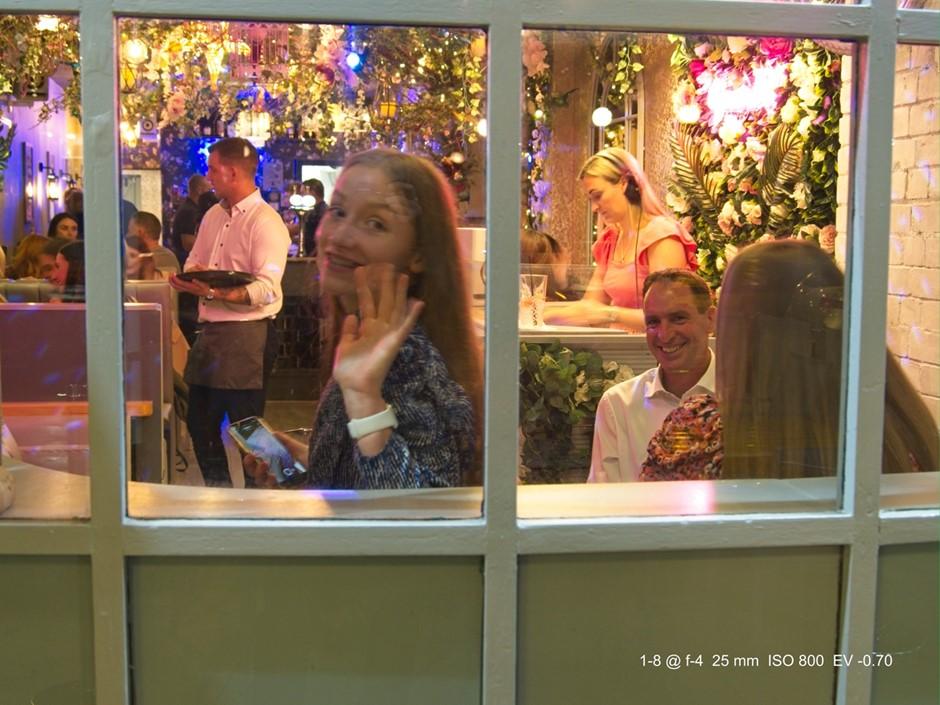 Selecting a bright subject (i.e. in a well-lit restaurant) whilst you’re outside (in the dark) is a good strategy, but you need to be aware of the pool of light that forms around windows.