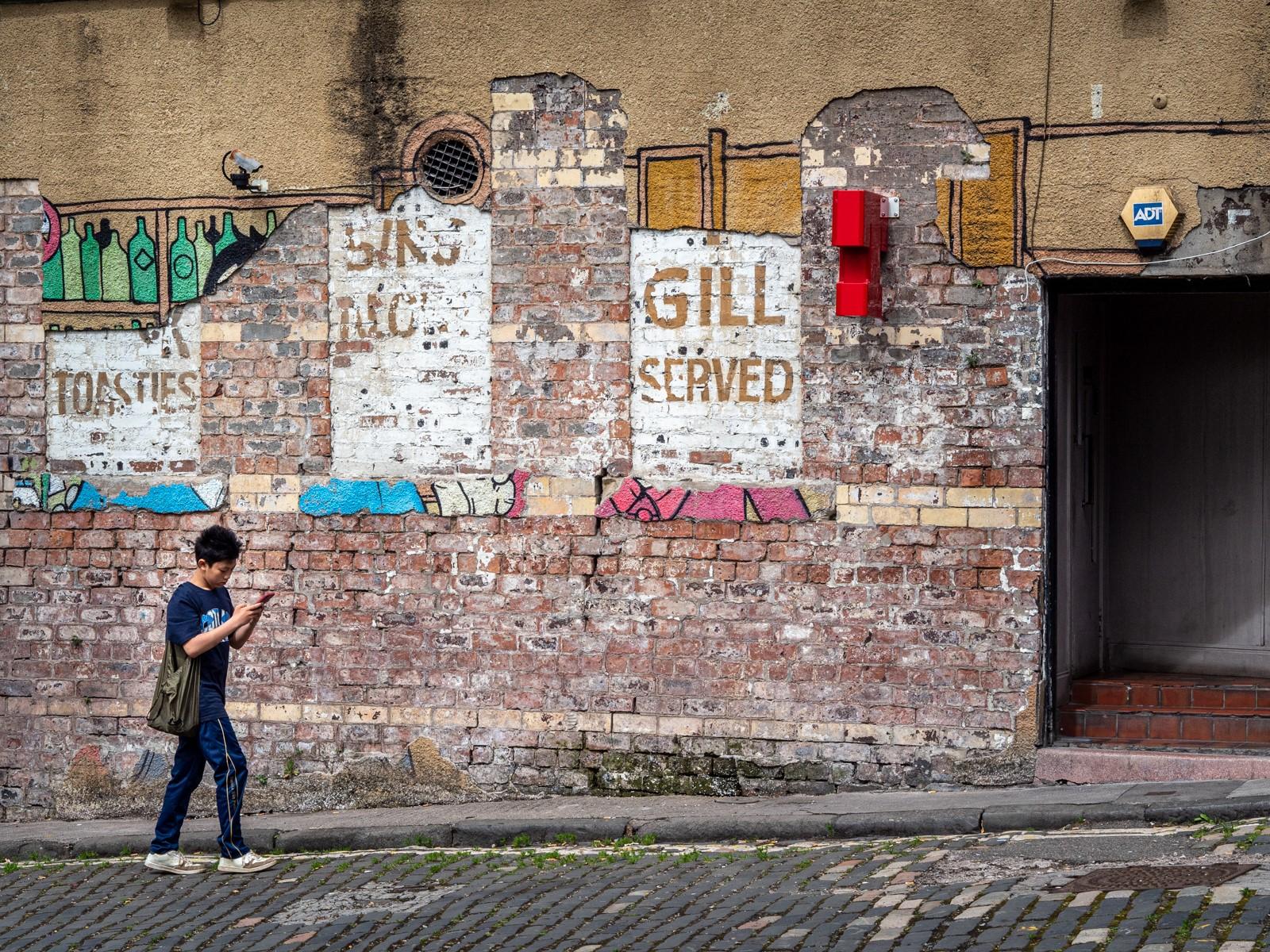 This first image (above) shows the inside of a pub. It was taken midweek at around 8 pm. Although I like the combination of colours, the composition and the abstraction, I do wonder why someone is sitting on their own (apparently) drinking beer with a sleeping baby. The metadata (bottom RHS of the image) shows a shutter speed of one 80th of a second at f2.8 and ISO 6400. People in the image were relatively relaxed (i.e. no motion blur). There’s very little noise (if you blow the image up quite large you can see some).