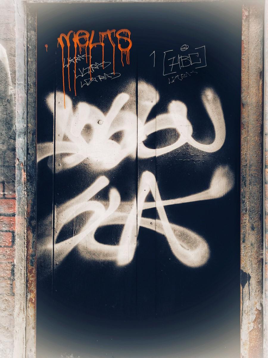 Graffiti scrawled on walls near to Central Station, writing on the wall and a young person engrossed in mobile technology