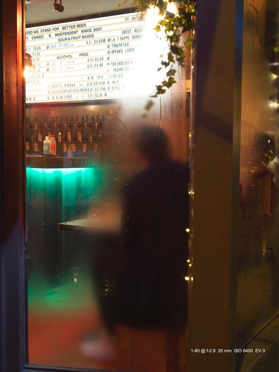 The blurred figure on the right is enigmatic: is he/she looking at the price list (deliberately left in focus and not cropped, and truncated making it ambiguous) wondering what to drink next? Are they on their own?