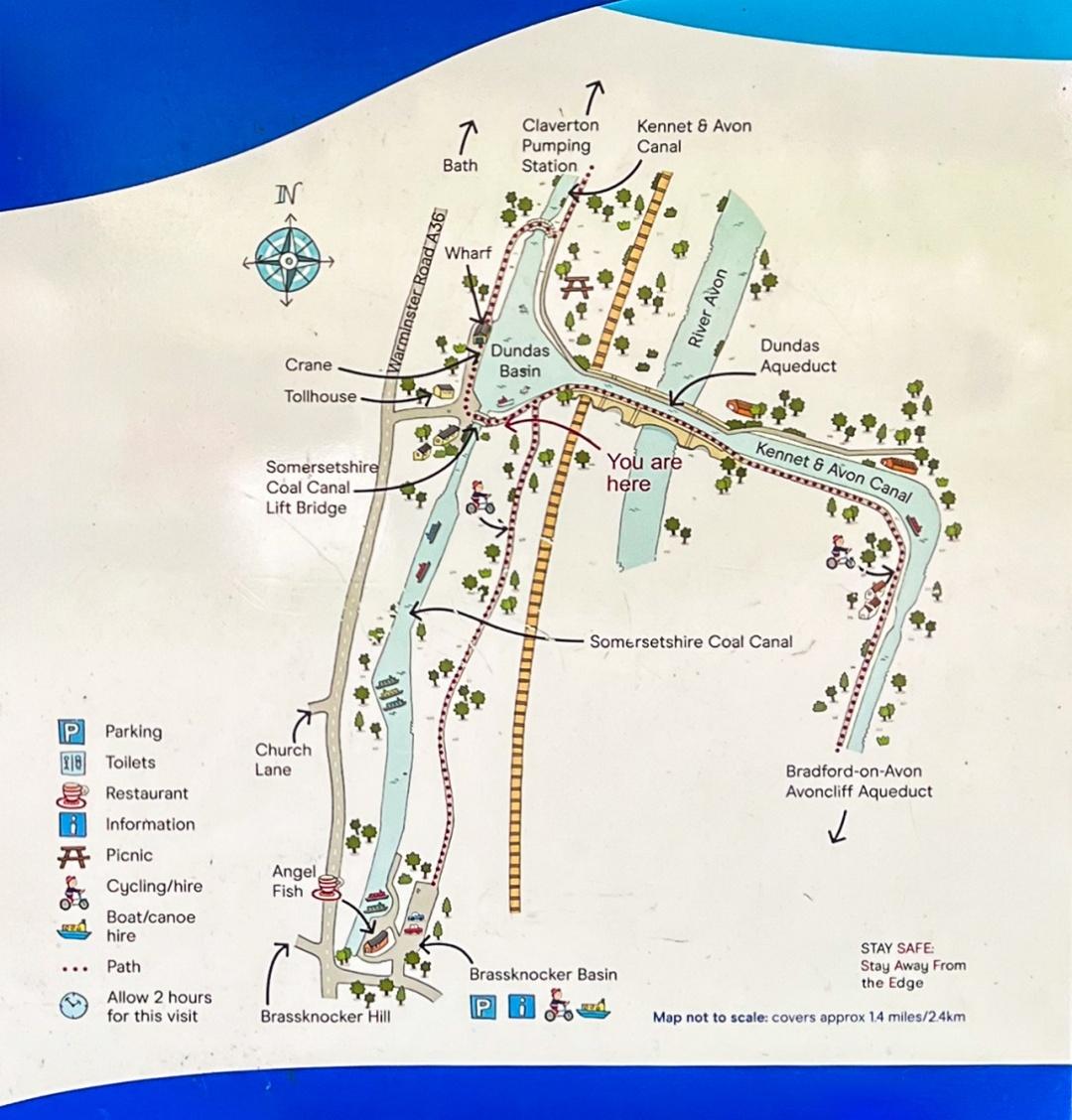 We walked through the Dundas Basin and watched, as canal boats moored up or waited their turn to travel across the Aqueduct, towards Bath or, in the opposite direction, towards Bradford on Avon. At Dundas we saw an old crane at the side of the lock. The sign said it was called an Acramans Crane which, in the late 1800s, was used to lift cargo and stone blocks on and off the boats. These stones were used to calculate the tolls a boat should pay.