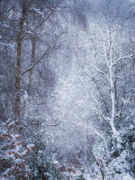 beck and call of the weather gods, so predicting when snow may fall or when hoar frosts occur is a matter of keeping a close eye on the weather forecast and keeping one’s fingers crossed. If I were to concoct the ideal conditions it would be freezing fog during the night with a cold, clear day to follow. One can then be transported to a magical world where trees become sugar-coated with soft rime ice, and the warmth of the rising sun creates patches of gold and silver. My sense of excitement is elevated even further when snow falls. This happened a few years ago when we received a good three or four inches of snow overnight. I had my camera bag, tripod and warm clothing ready and waiting in the hallway. Just before I left I remember telling my wife that I would be back in a couple of hours - I returned six hours later with a bulging memory card!