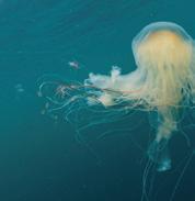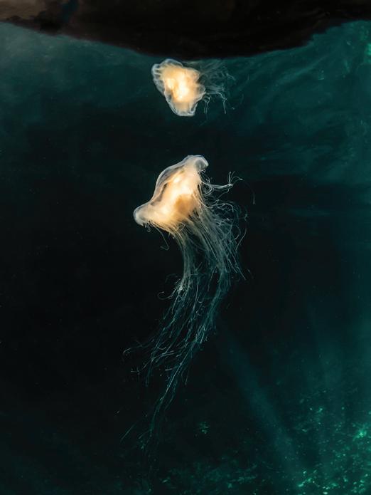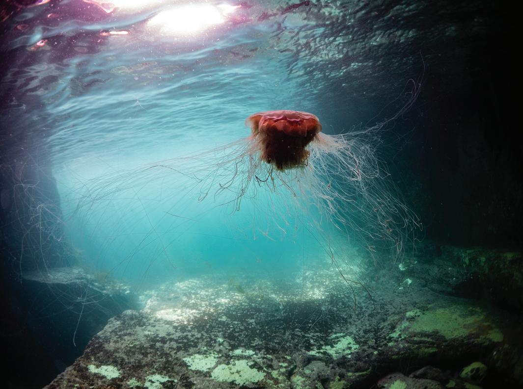 the face of the stinging tentacles, I start to watch them up close. I become mesmerised at the way they pulsate through the water; with my dome port pushed up close to them, they allow me to record their beautiful translucent bodies as I dive down into the water, following them as they get deeper. The peace and quiet under the waves is hypnotic.
