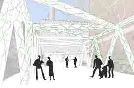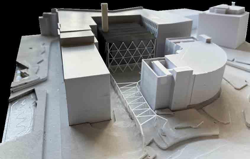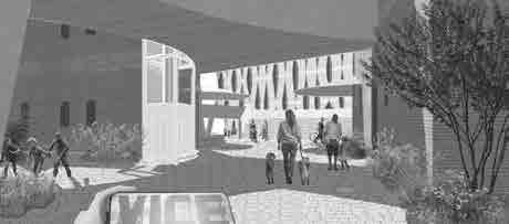 Due to Centennial Commons lack of usage during the Winter and shoulder seasons, the initial exterior move comes in the form of a trellis reaching out to Centennial, leading to a vertical park to the south. Drawing inspiration from surrounding market spaces, we sought to provide a platform for local organizations, both from the community and Northeastern, to have an area to display and sell goods. In addition, ISEC is currently Northeastern’s only interdiscplnary research space. By placing it adjacent to the market spaces, we hope to provide a more public facing space for research and development, establishing a better connection between the research within and the people who would benefit from it.