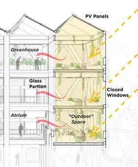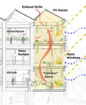 The ground floor pulls the active pedestrian street into the public through way by providing places of refuge and vegetation. The ground and first floor provide storefront for various occupation types, enabling the public to interface with business owners without entering private spaces. The floors above provide living spaces for the store owners, enabling a live - work dynamic with the verticality creating a natural split. Finally, shared amenities and energy production are found at the top, creating space for shared privacy amongst residences.