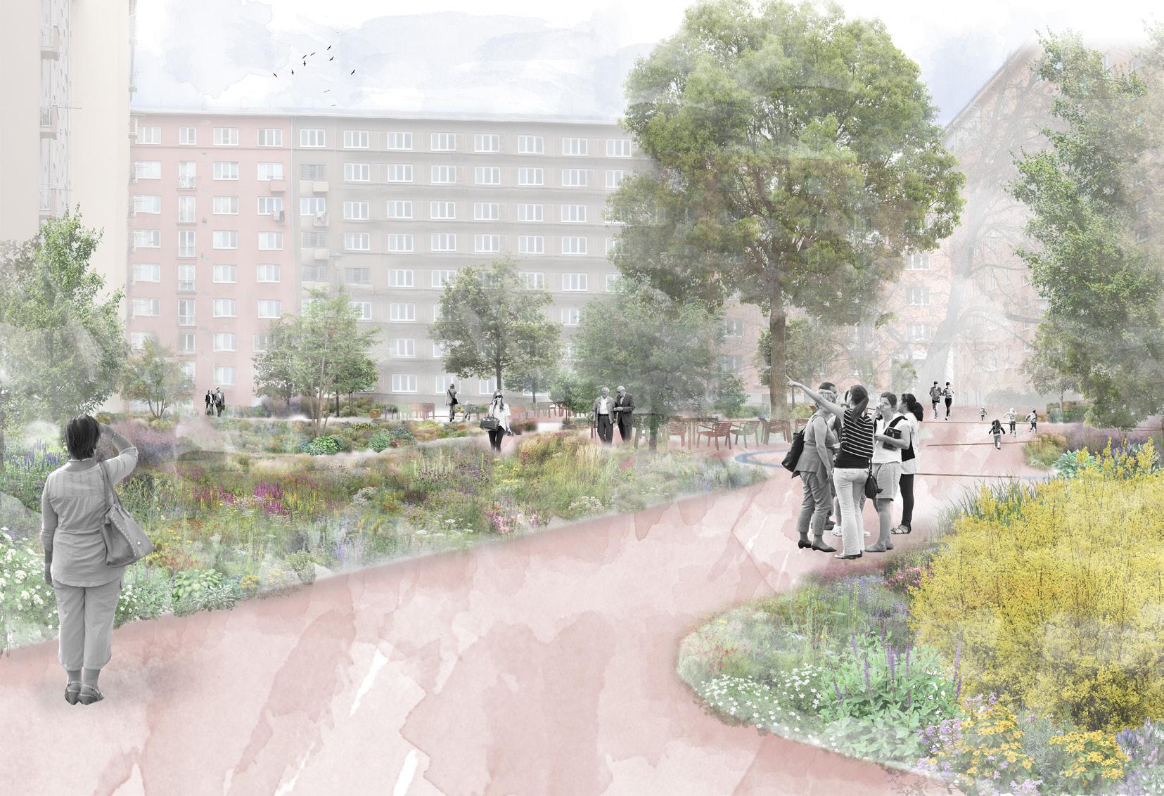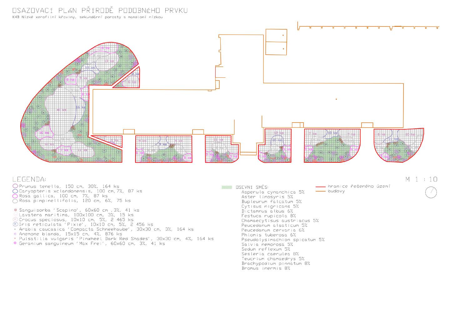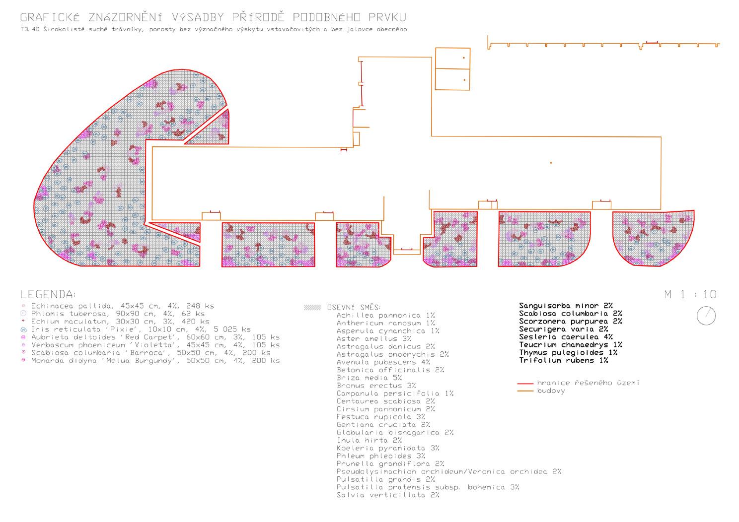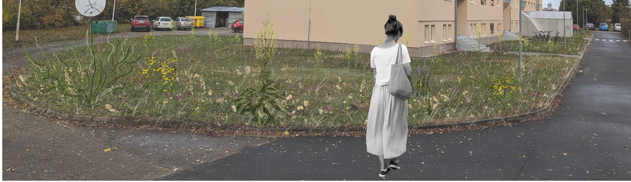The new concept of the courtyard is to introduce elements of the wild nature - wilderness into the austere geometric urban environment, mainly by using wilder and more original types of vegetation. By working with water elements, it supports the improvement of the microclimate, owing to solving the traffic and parking situation, it makes passing through the site and spending free time more pleasant.
