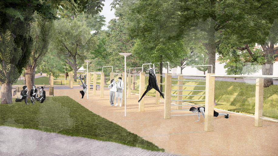 The proposed elements include, among others, a shelter for cyclists, toilets, the modification of two children‘s and two sports playgrounds, a fire pit, a new outdoor gym, a picnic table, chess tables, raised beds with a well and a composter, a pergola, a tea pavilion over the Ponávka creek bed, and a small park in front of the cemetery.
