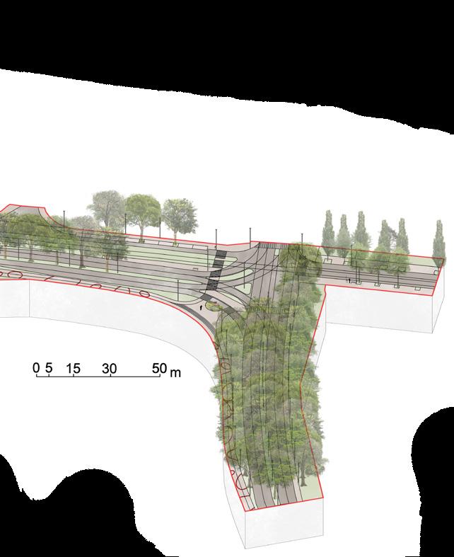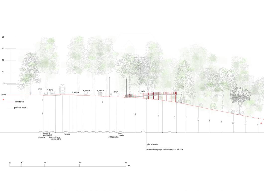 The concept narrows the oversized four-lane road into two lanes to create pedestrian and bicycle connection of the Faculty of Regional Development and International Studies with the rest of the Mendel University in Brno campus by a publicly accessible route. This path is not only an operational connection, moreover it becomes a walking promenade covered with treetops, complete with numerous seating areas and a viewpoint looking into the adjacent arboretum.