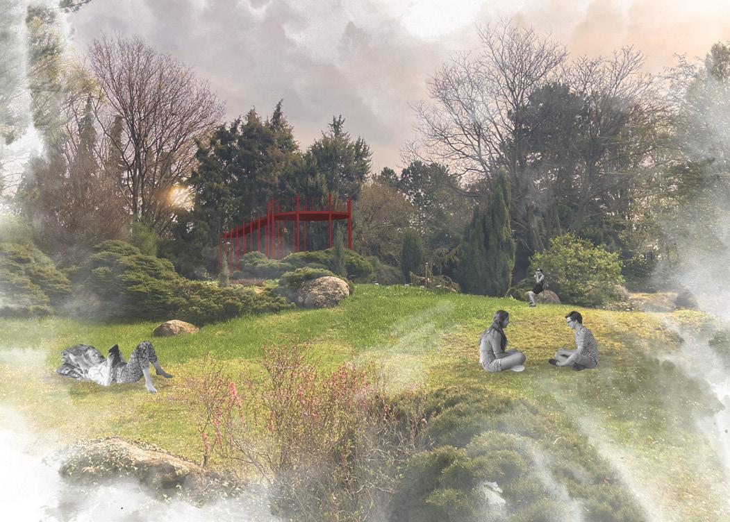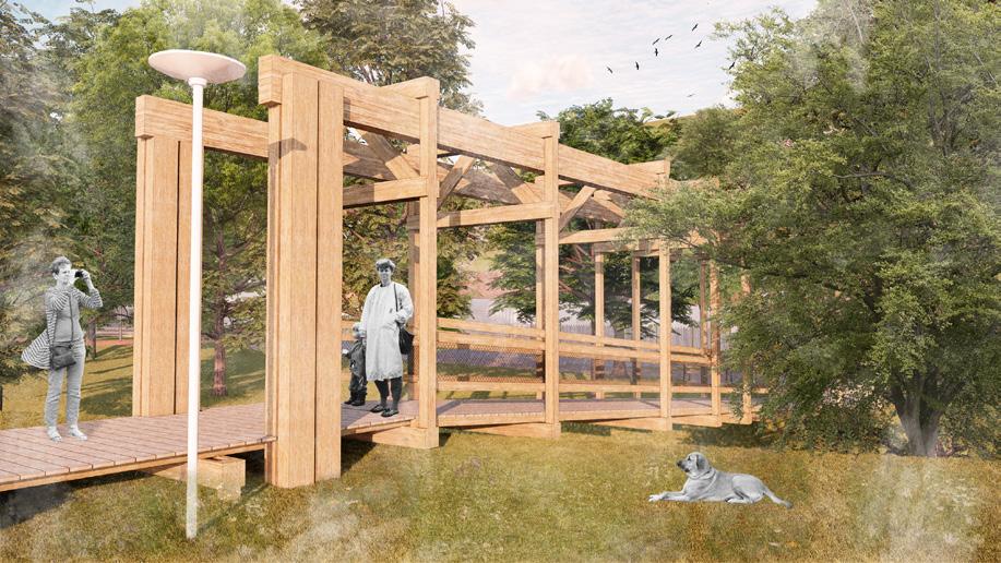 The chosen solution aims to attractively connect the Mendel University in Brno campus outside the arboretum on the třída Generála Píky. The proposal tries to respect the integrity and atmosphere of the arboretum and the privacy of its visitors as much as possible, and offers passers-by the opportunity to se the inside without paying, just by means of a wooden viewpoint, color-matched to the elements in the arboretum. The curves, which are fragments of the ellipses used in the arboretum and match in color to the viewpoint and selected furniture, are painted on the surface of the promenade. The modification of the park at the Bieblova tram stop improves access to the tram and also offers a place to rest.