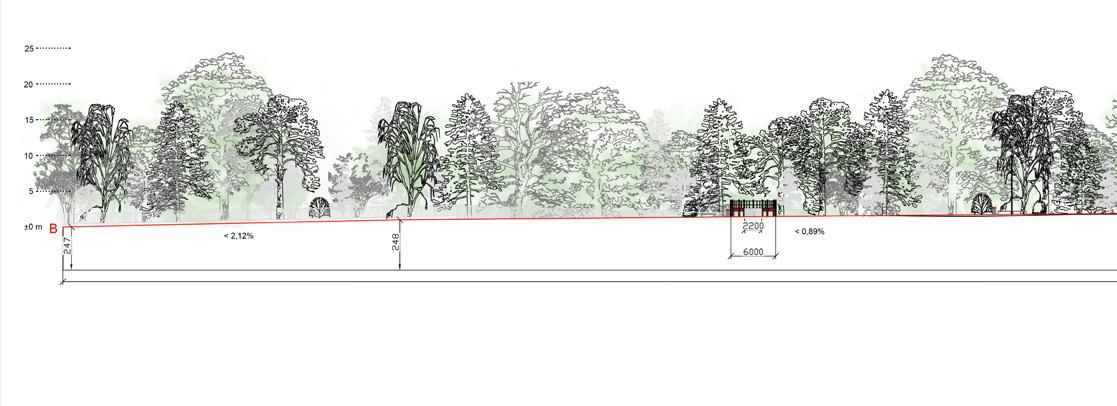 The proposal leaves most of the original terrain and only adjusts the cross slope of the individual lanes of the grade. In the place of the mixed path for pedestrians and cyclists, there is a more pronounced leveling of the terrain and in some places a slight shift of the slope beyond the border of the promenade in places. Even on the other side of the street and in the park, the terrain is slightly modified for the purpose of better draining and treating of rainwater.