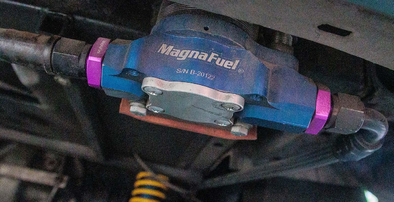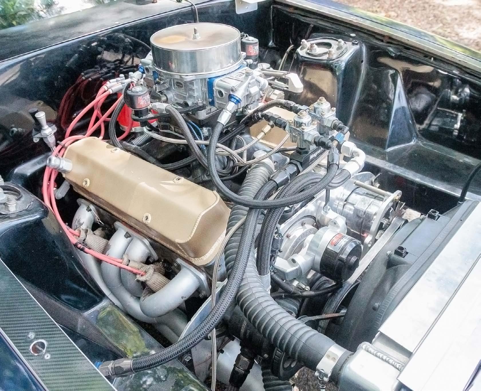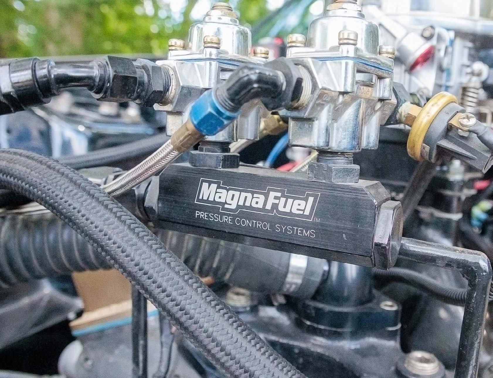 Dual Aerospace Components 350 fuel pumps keep the high octane fuel flowing for the carburetor and the nitrous system, and big tube headers collect into a 3.5-inch exhaust and Dynamax bullet mufflers to provide the spent gases an easy exit path.