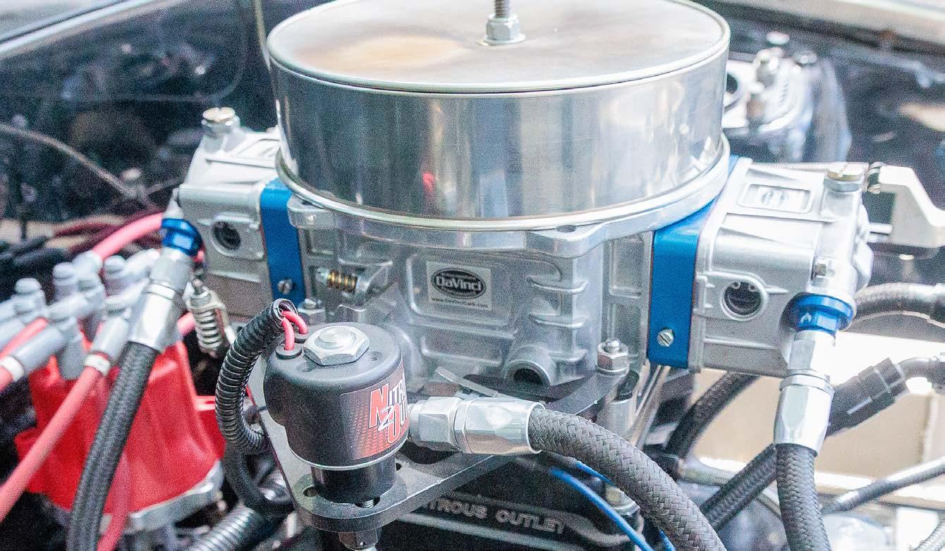 Boosting the smallblock is an NX two-stage nitrous oxide plate system that was placed above an Edelbrock Super Victor Jr. intake. In keeping with Tankalavage’s desire for carburetion, fuel mixing is handled by a custom-built Holley 750cm carburetor from Pro Systems.