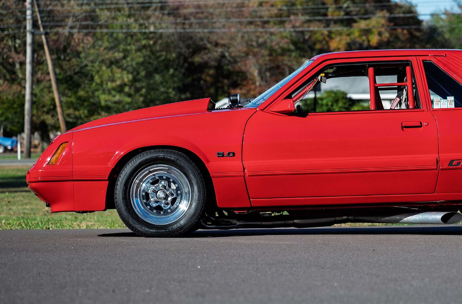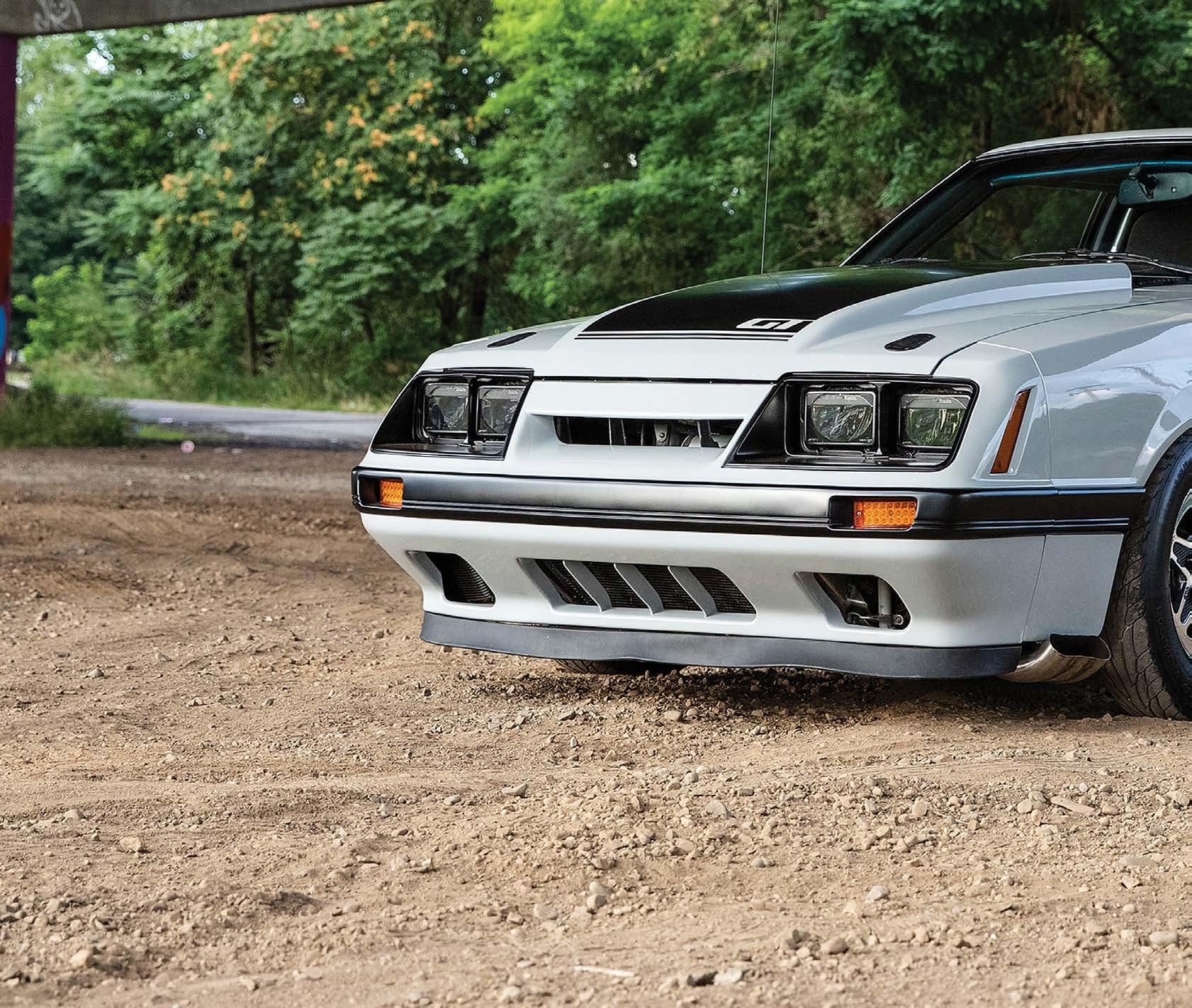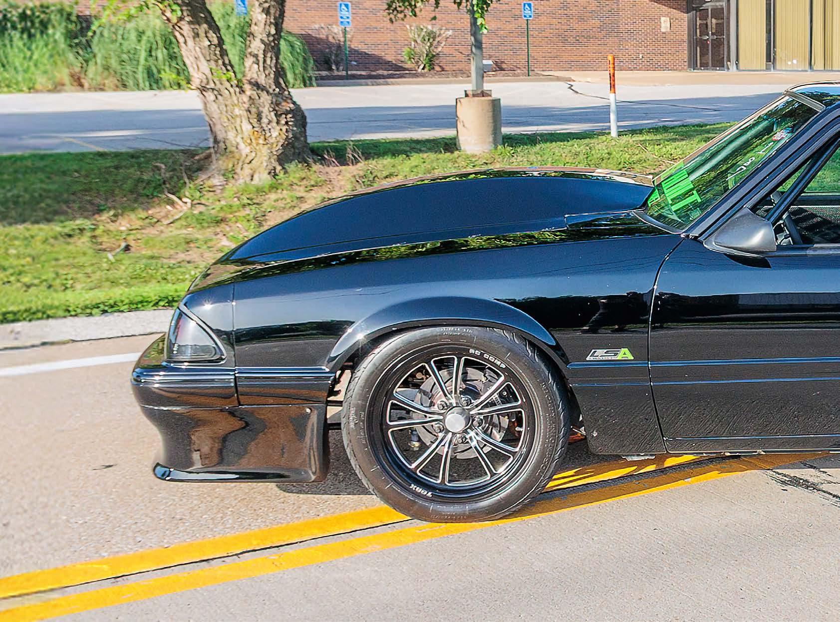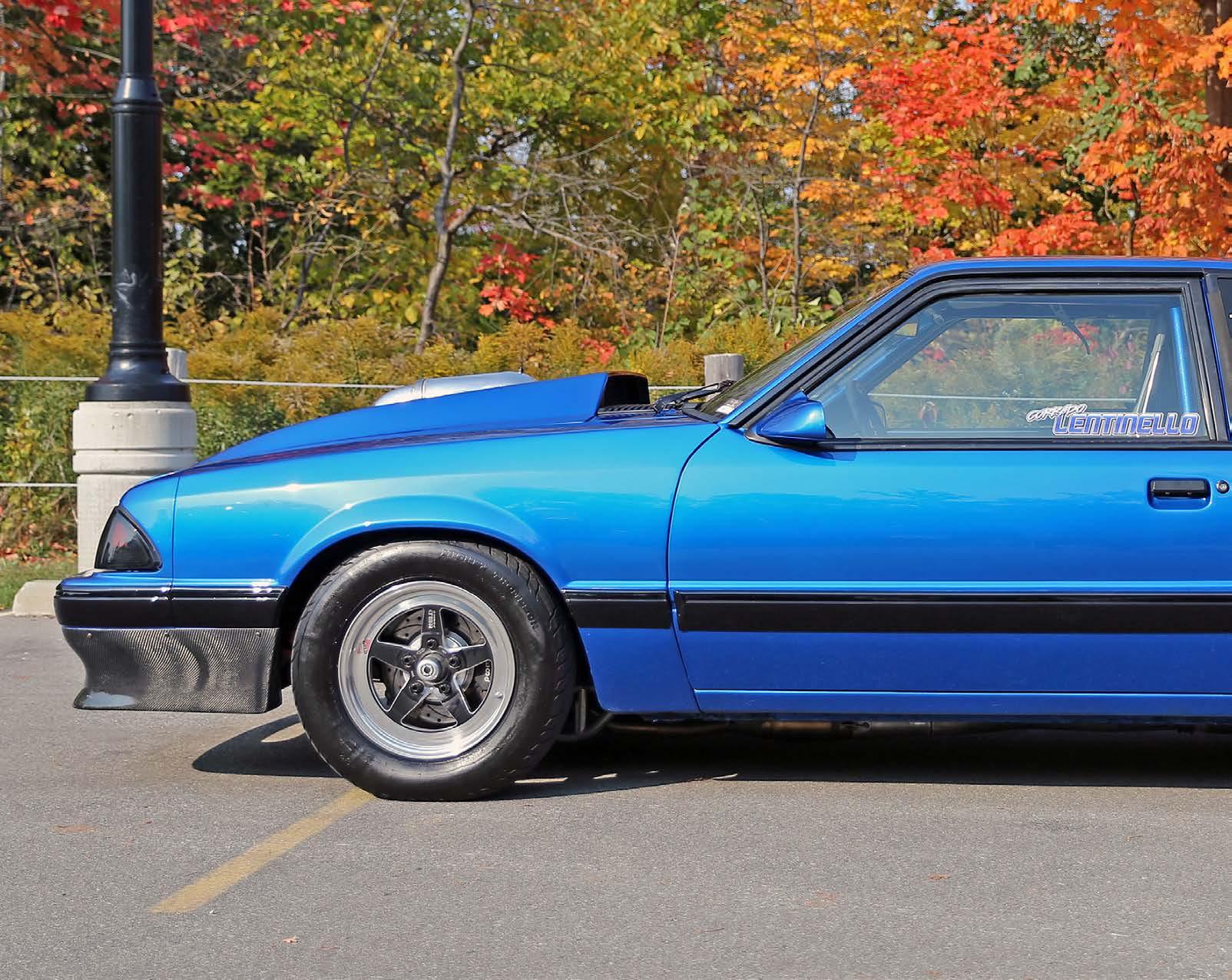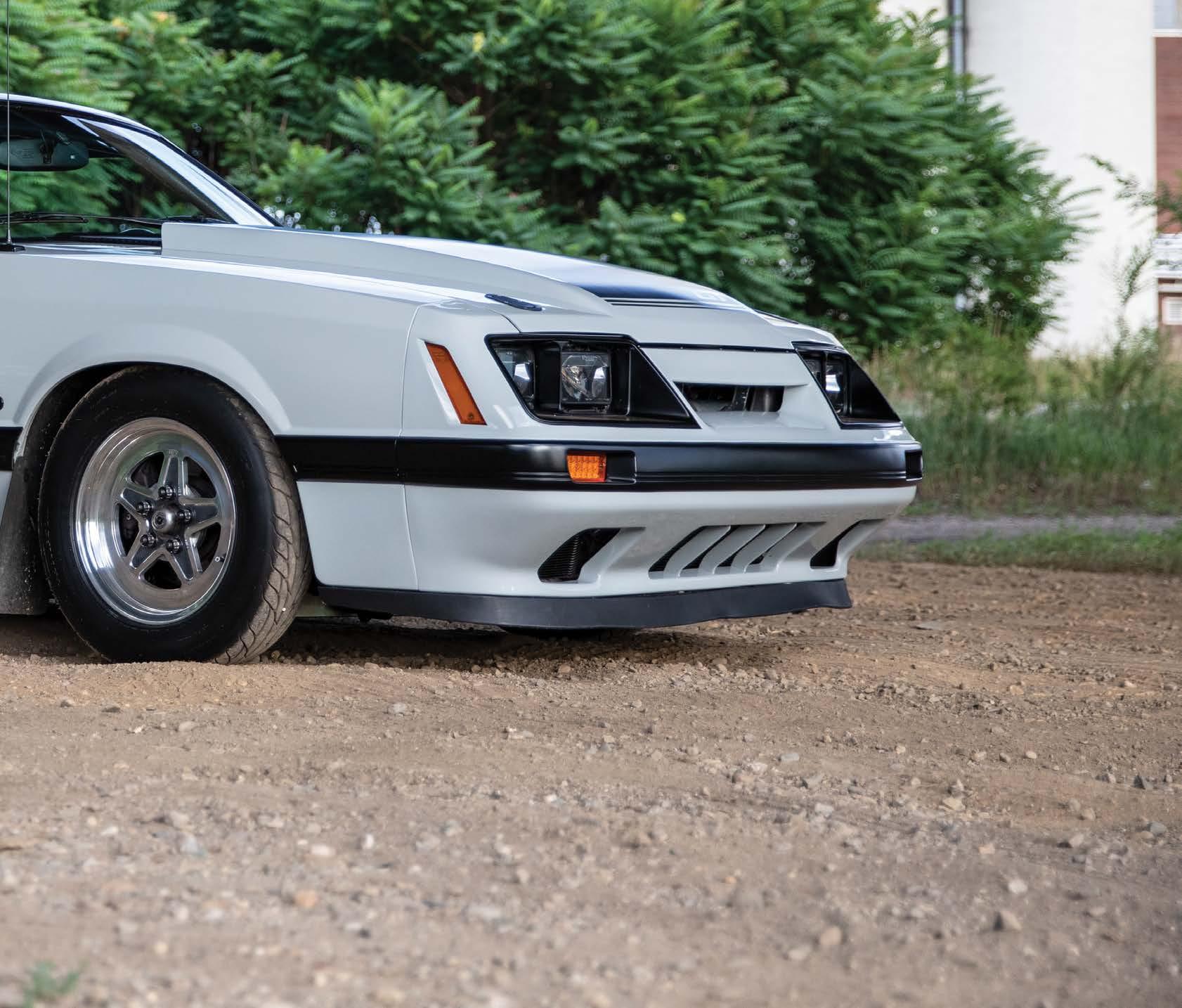 The slick paint on this Fox Body looks so nice because the owner is a painter by trade. The car is all original steel except for the fiberglass hood and carbon lower bumper extension