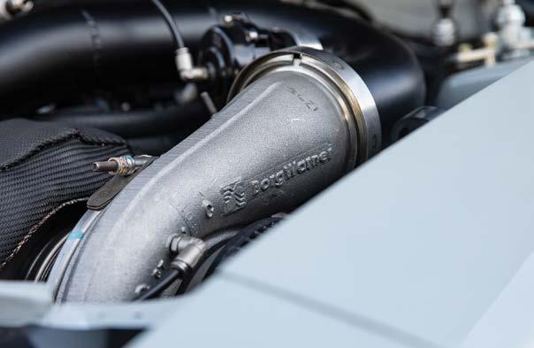 All turbo piping was handled by MAF Racing. The satin black gives the piping a less prominent look under the hood but there’s no mistaking the large aluminum turbo housing (right)
