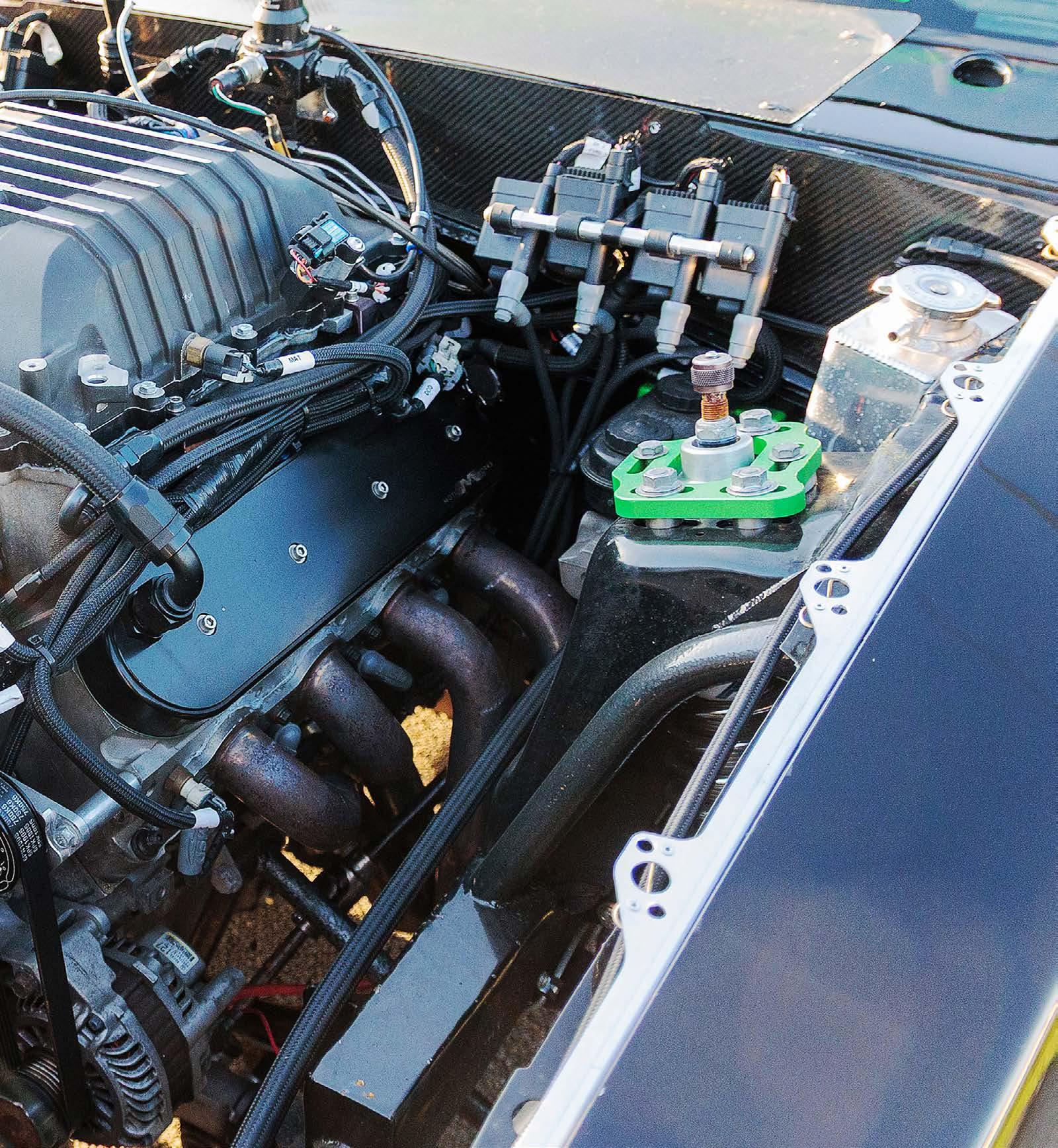 A Capizzi TH400 transmission with JW bellhousing, Ultimate Converter Concepts 9.5-inch converter, Meziere billet heat exchanger pan and GV overdrive unit transfers the boosted Coyote power rearward through a CCI Driveline 4-inch aluminum driveshaft.
