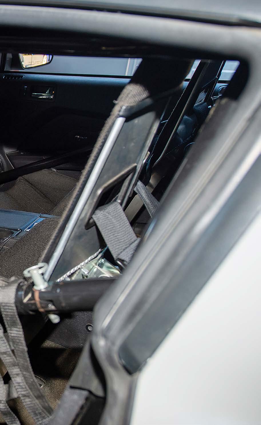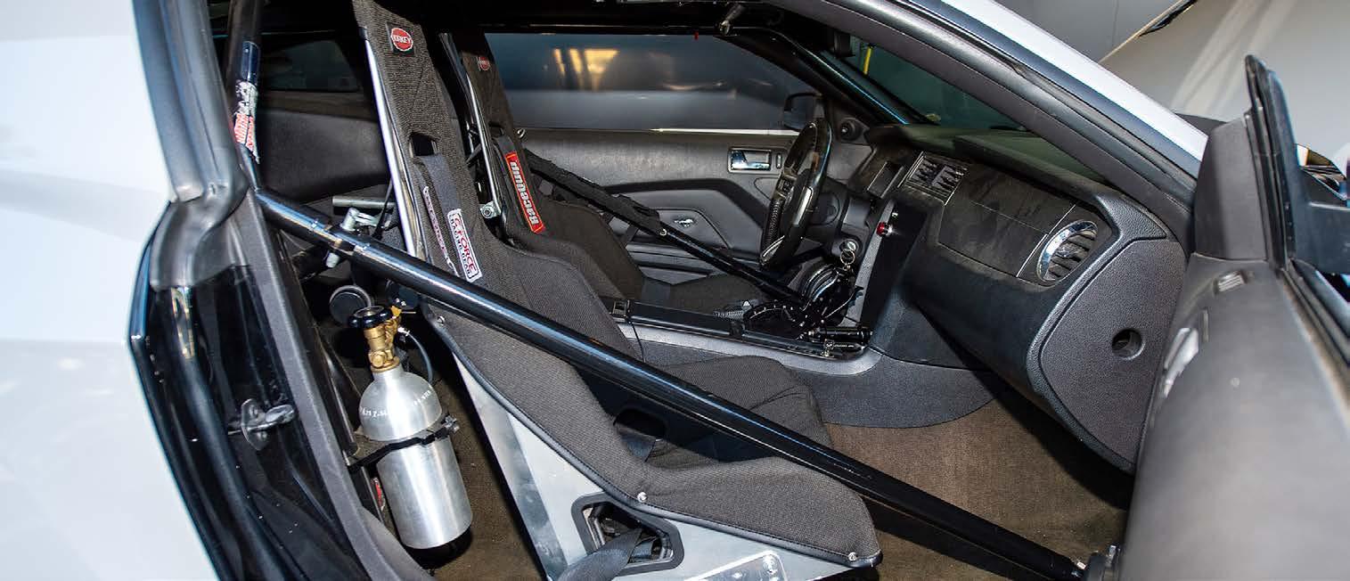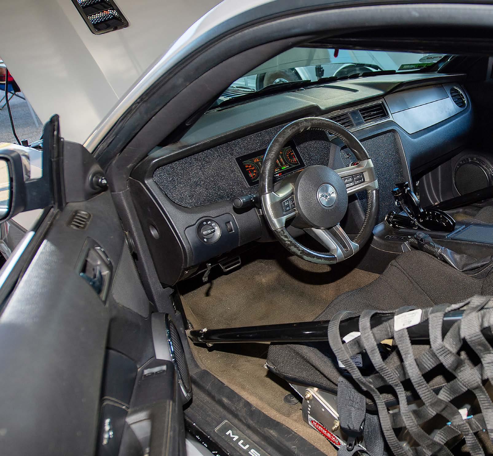 A good chunk of interior trim was kept, including the dash, console, trim and carpet but additional racing upgrades in the Mustang’s interior space include a 6.86” interactive Pro Dash, Motion Raceworks TH400 air shifter, a pair of race seats, and Racequip safety belts.