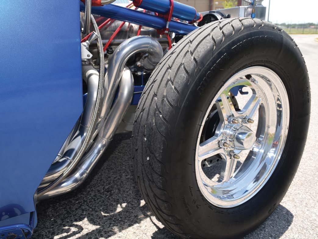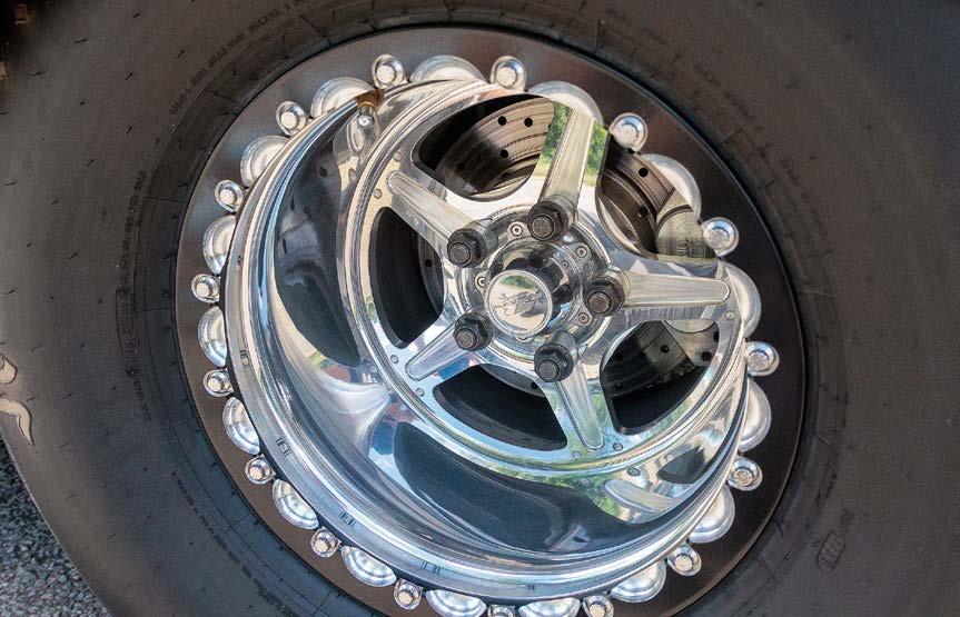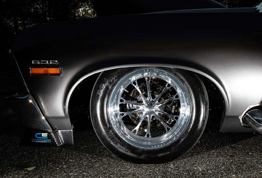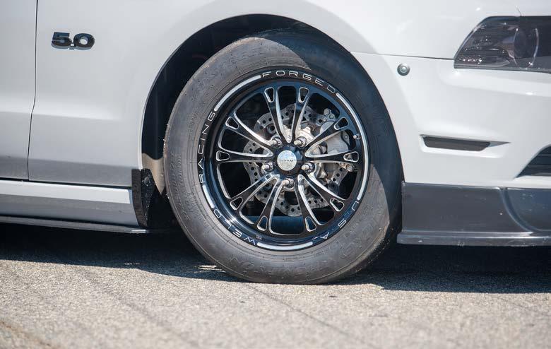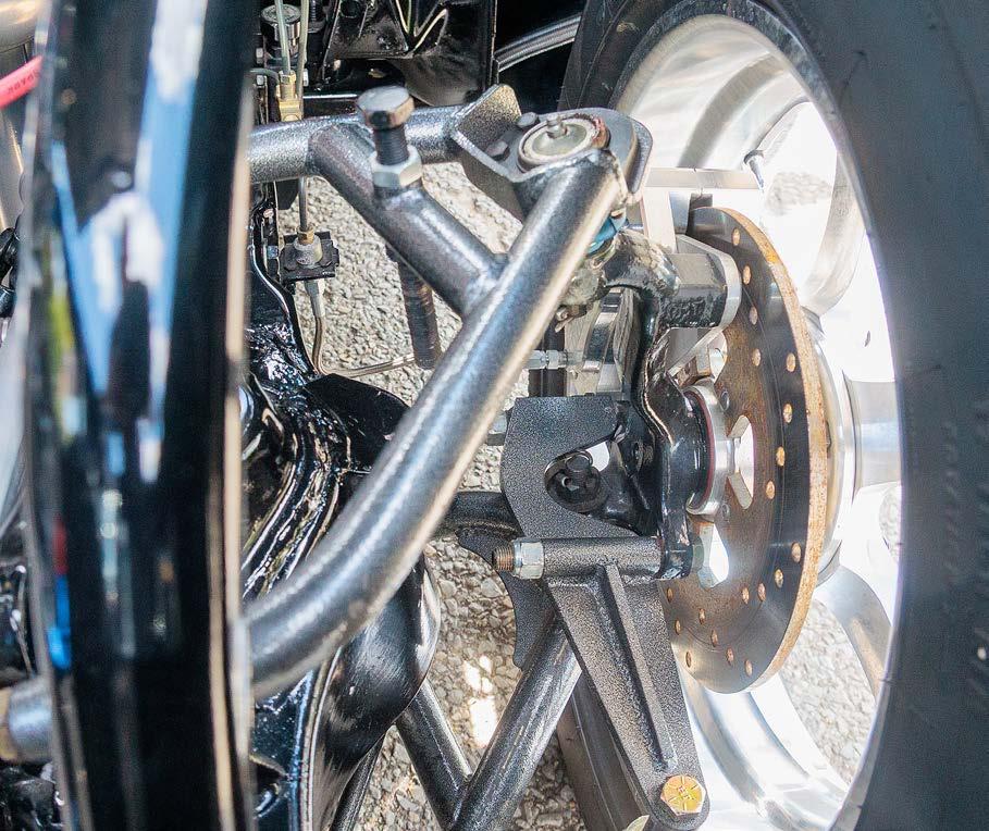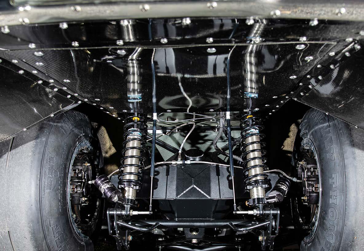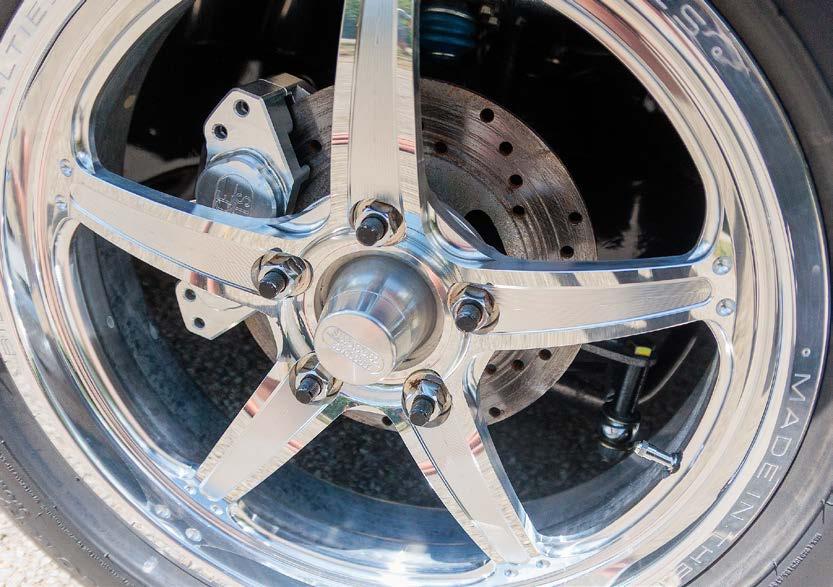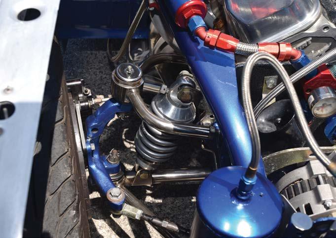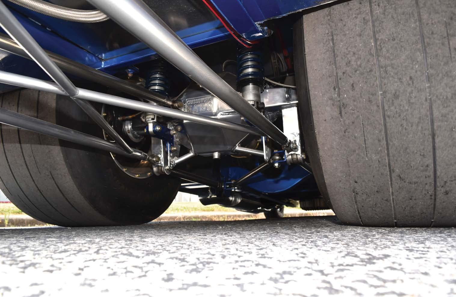 coilover shocks work with an anti-roll bar to properly stick the Mickey Thompson Radial Pros to the pavement. Up front, Kelltrac coilover struts maintain attitude while V Series wheels frame TBM’s Medium-duty drag racing disc brakes.