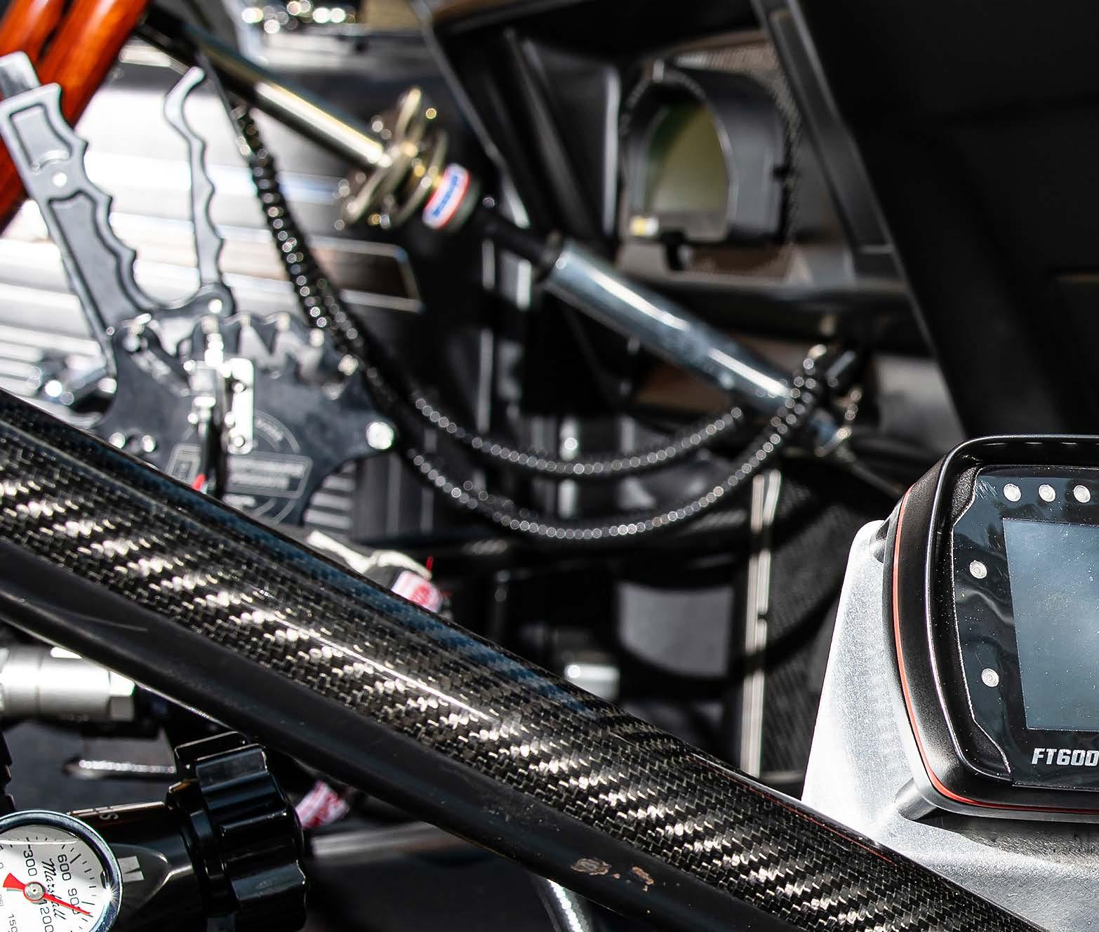 From there, Naumann is protected by a maze of bars that make up the Precision Chassisbuilt 6.0 certified chromoly cage, and monitors and controls the massive amounts power afforded by the 632 mill via various components from Fuel Tech, Race Pak and M&M Transmissions.