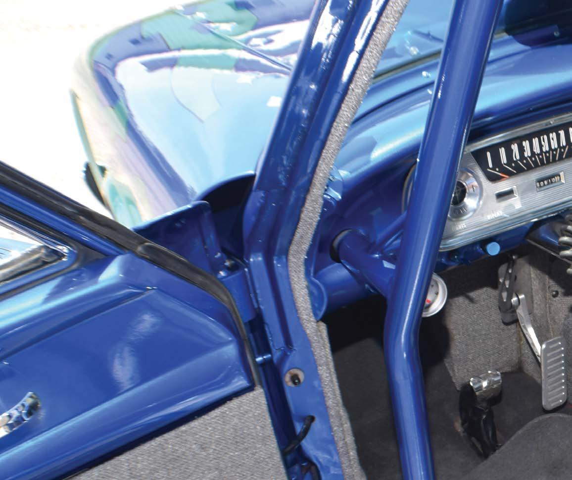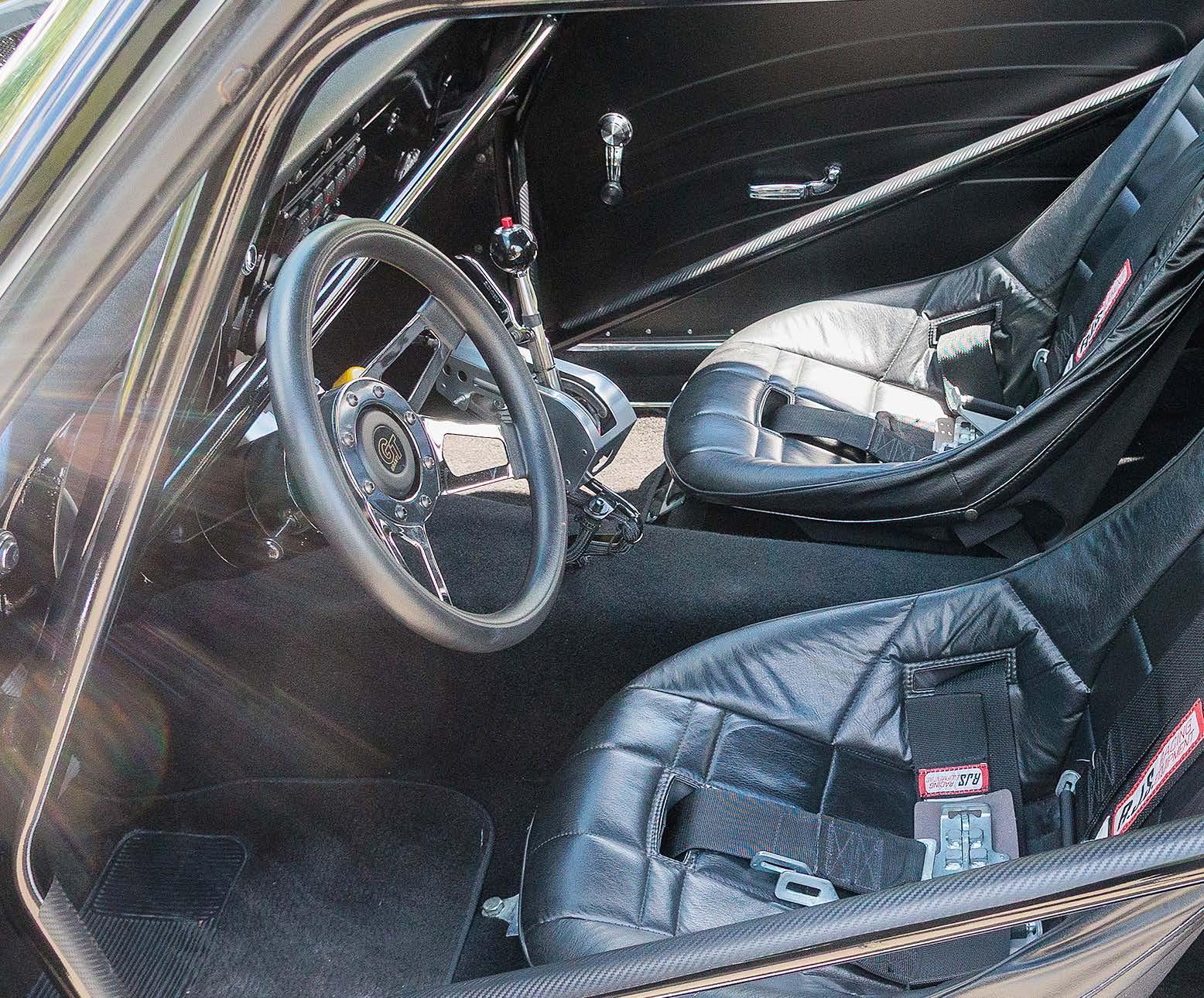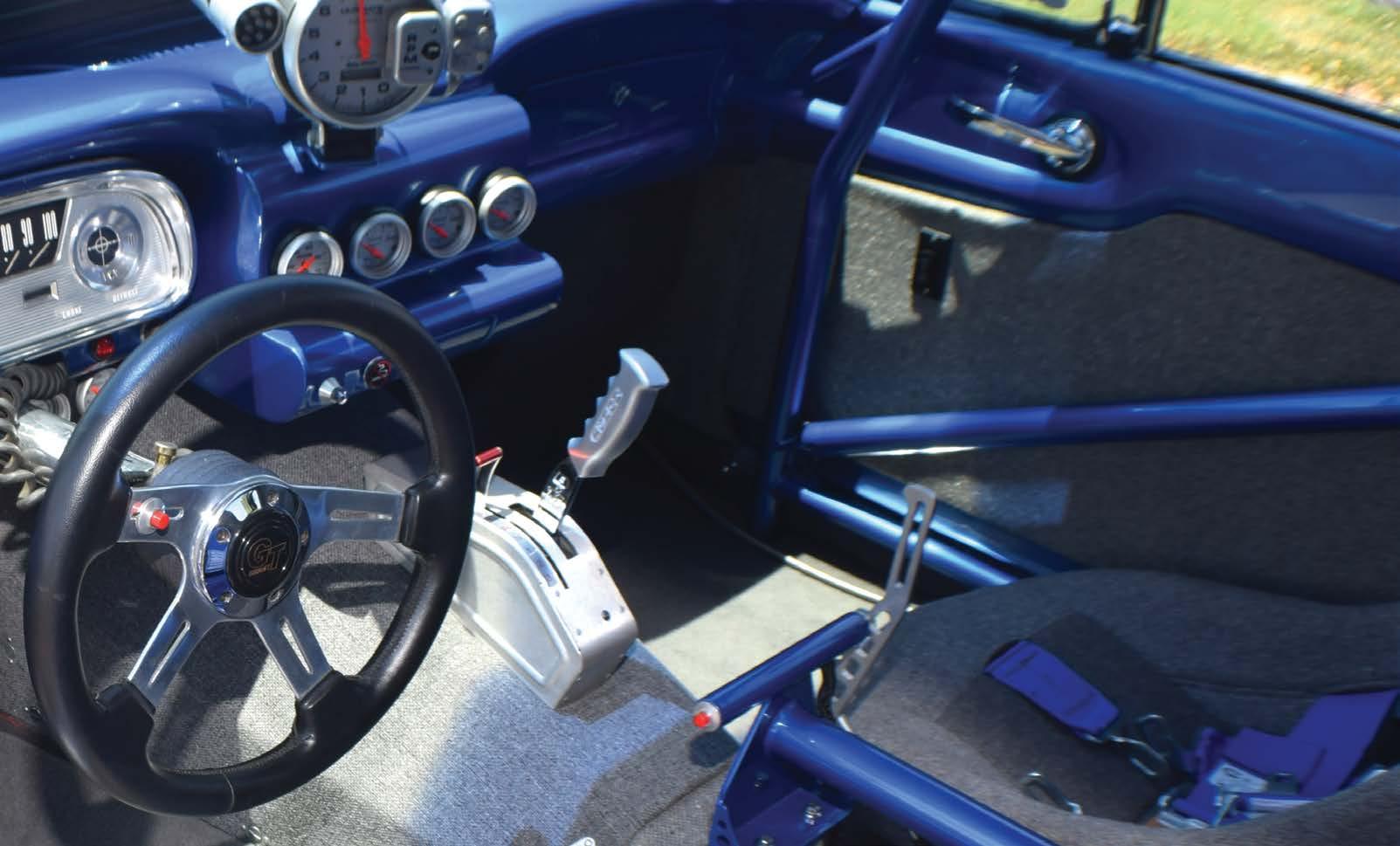the interior of this Chevy is clean, finely detailed, and appropriately appointed. The original dash remains, but the remainder of the cabin has been updated with raceoriented options, such as the aluminum door panels, Grant steering wheel with quickrelease, and racing bucket seats.