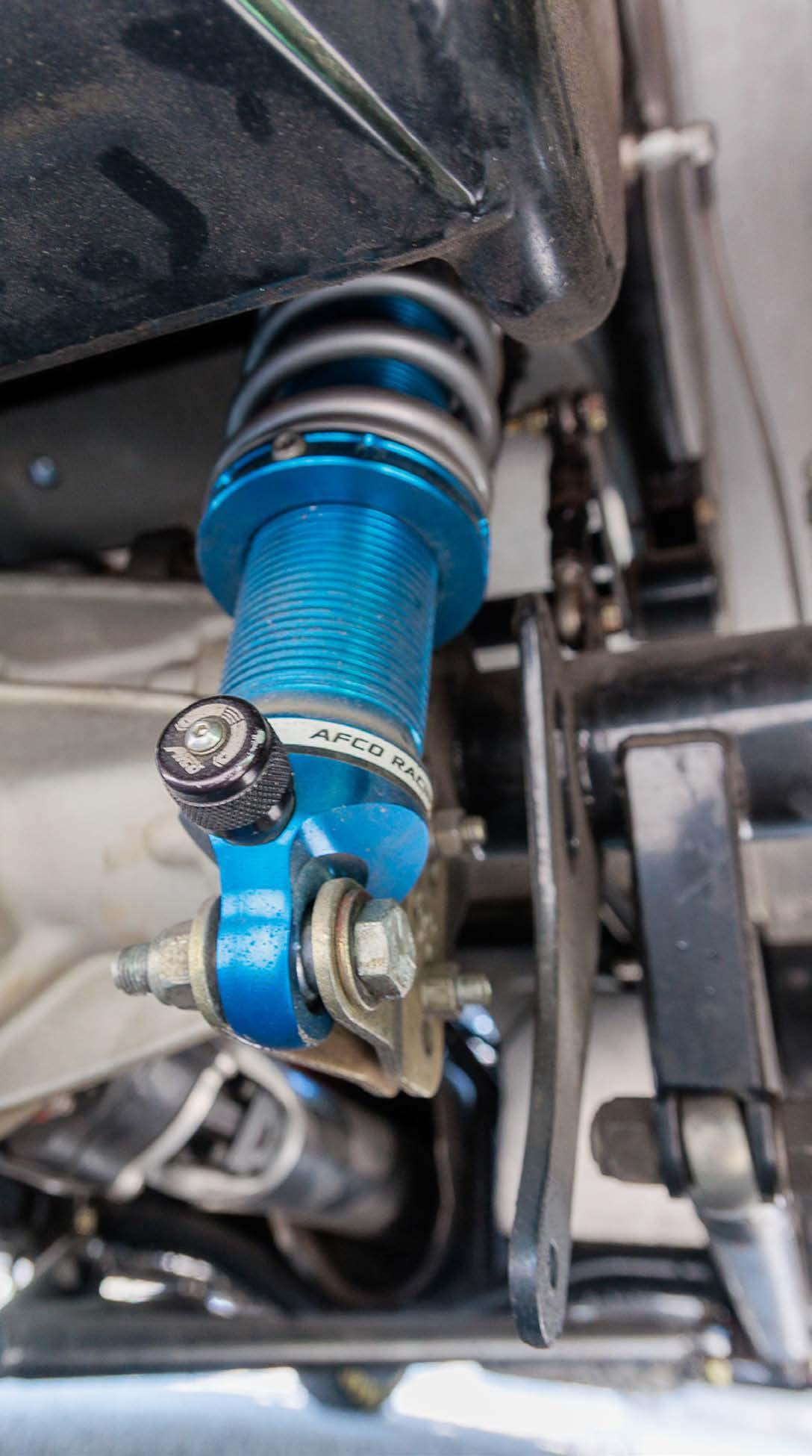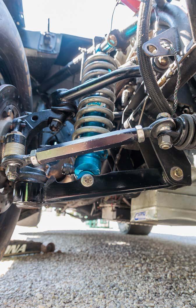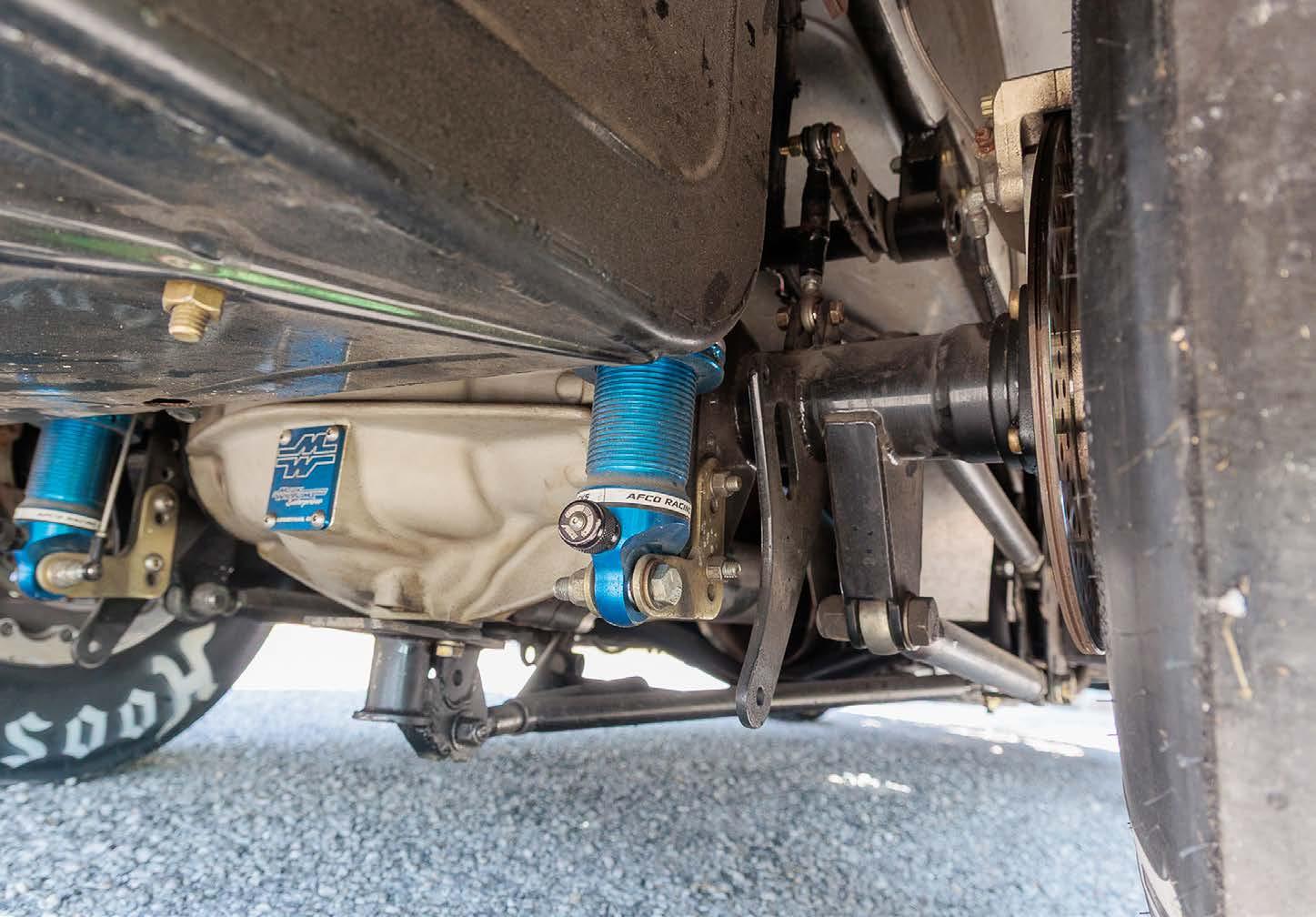 FRONT: Mustang II suspension with Strange doubleadjustable shocks and Hyperco springs. REAR: Alston 4-link with Strange double-adjustable shocks and Hyperco springs.