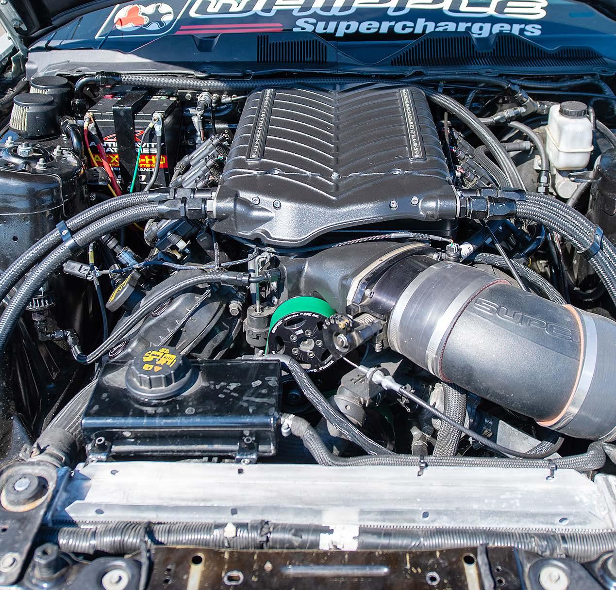 Although the underhood space could pass a factory install, hooked on boost, Smith swapped up to a Gen 6 3.0 Whipple, equipped with race-spec rotors and intercooler, a 10-rib belt, and a 150mm throttle body. Triple Fore 450LPH fuel pumps and ID1700 injectors provide fuel to the blown mill.