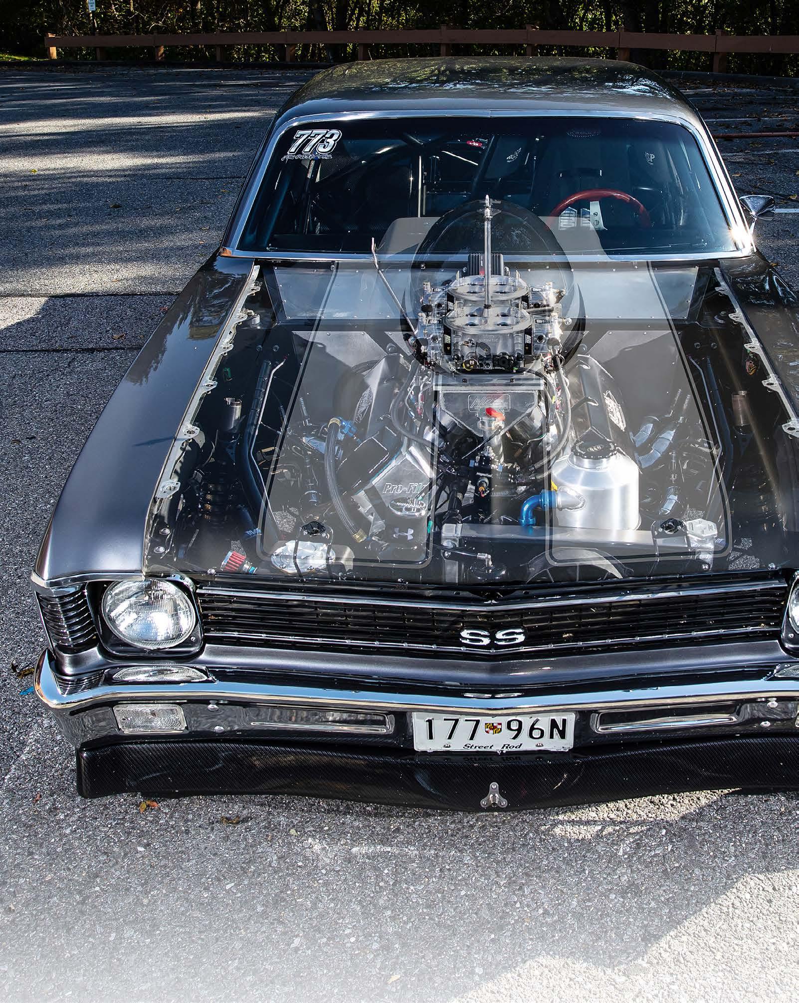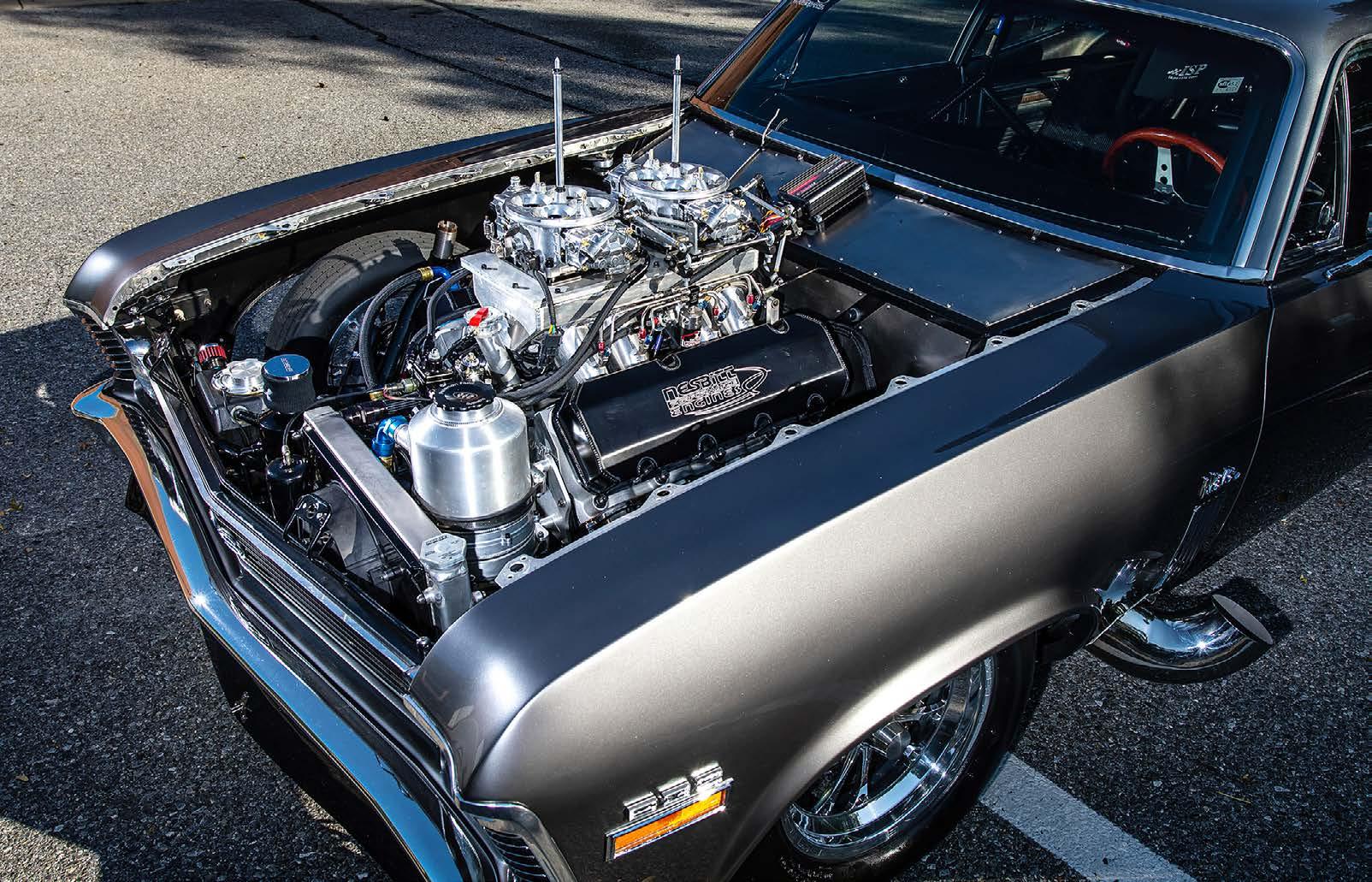 This series of shots shows what hides under the Nova hood….A Nesbitt built nitroused 632 inch big block!