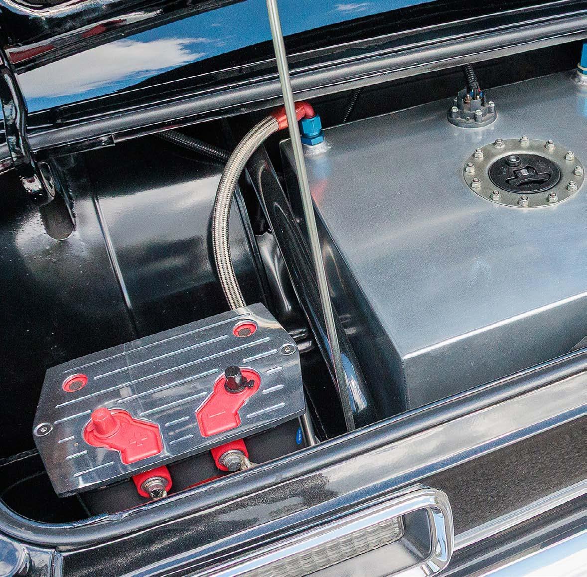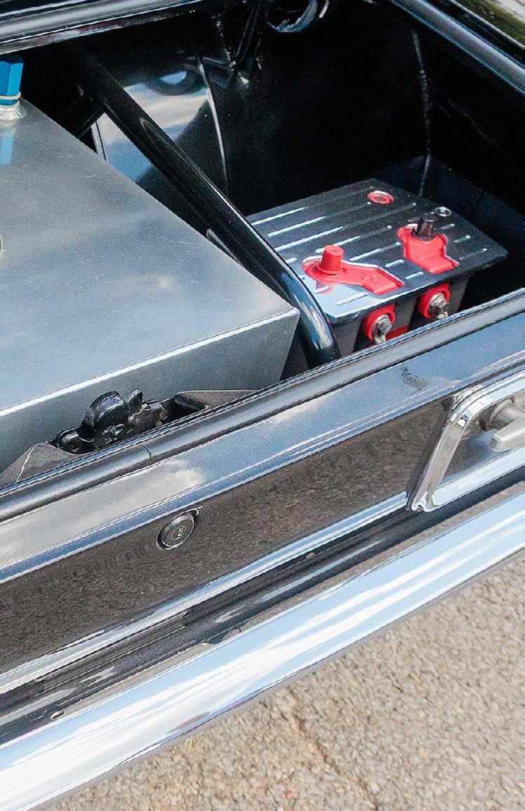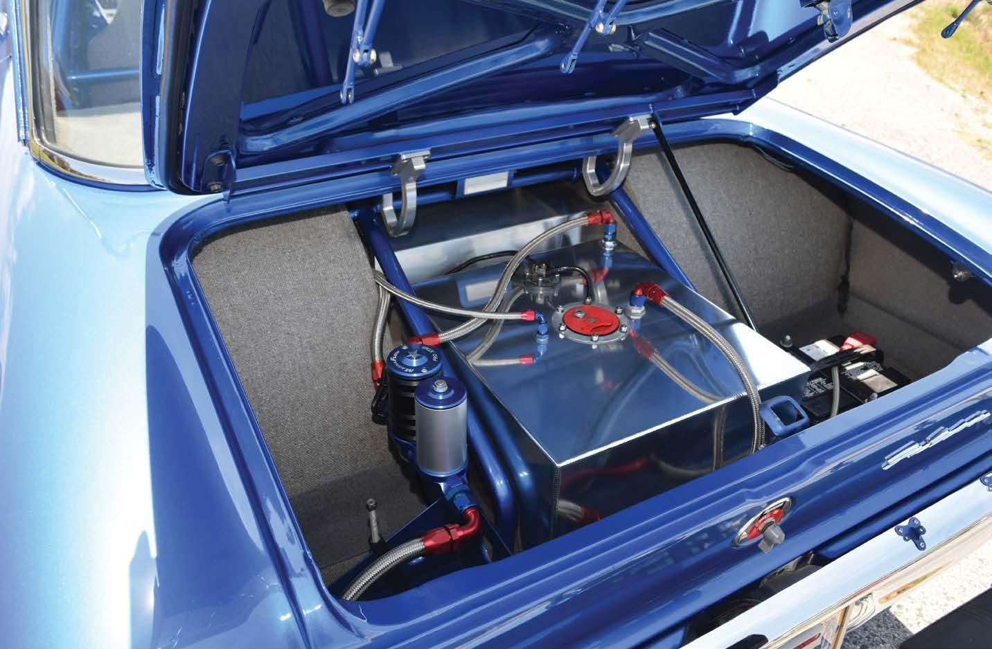 The former strip warrior’s transformation is nowhere more obvious than in the interior and trunk, where a full tweed cockpit has been installed around the body-color mild steel cage. Britz even commissioned a replica of the original door-mounted VIN tag to prove it is a legit titled and plated street bruiser these days. A polished fuel cell supplies the MagnaFuel pumps in the super sano trunk.