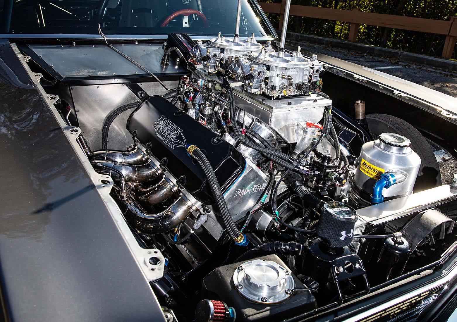 bore space mill using a Brodix block. Inside, a Bryant crank spins MGP rods partnered with Gibtec pistons while a Jesel belt drive synchronizes the rotation with a Comp cam that bumps BAM lifters. Profiler 12-degree heads are equipped with Jesel stainless rockers and an HRE sheet metal billet runner intake manifold is topped by twin AED Carbs.