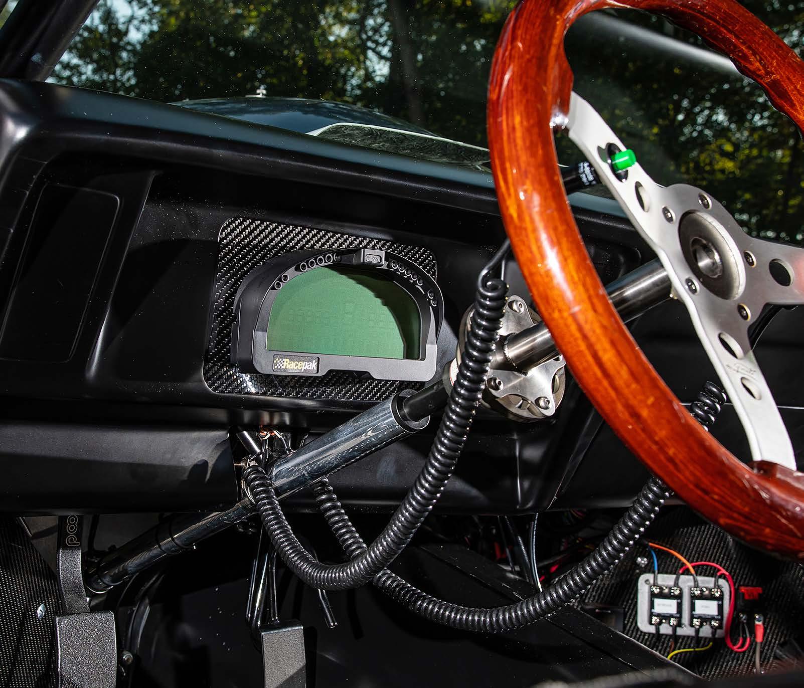 Inside, Naumann chose to continue with keeping an assortment of factory goodies in place, including the dash panel, door panels and headliner which includes the OEM dome light. The high gloss wood steering wheel is about where the 1970’s factory look meets badass racecar, as it is attached to a lightweight quick-release column.