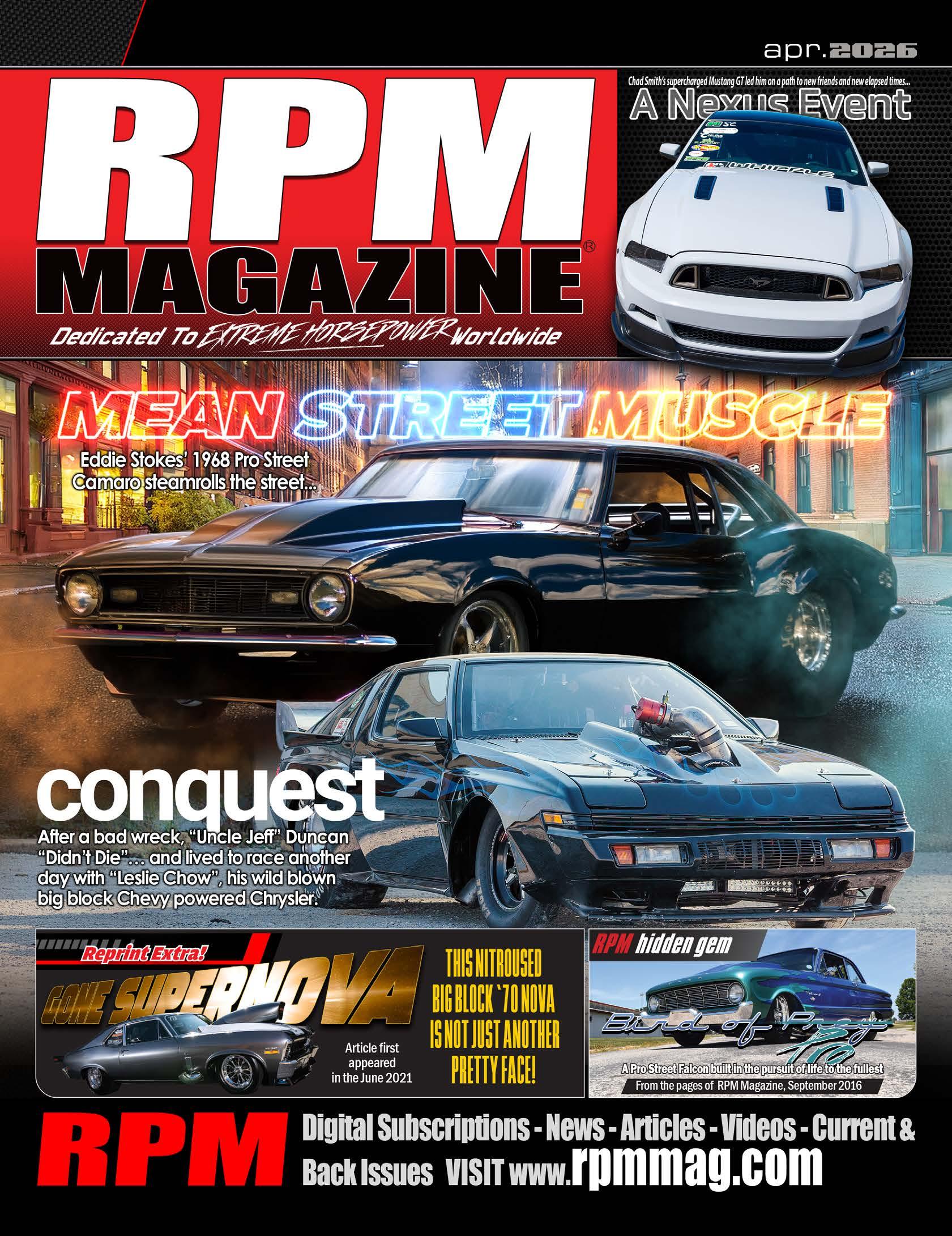 The focus of RPM is to bring a diverse mix of high performance street and race automobiles to life within its pages including race cars, muscle cars, hot rods and street legal machines with an emphasis on the “EXTREME,” including fast doorslammer and outlaw forms of drag racing. Not familiar with these types of cars? They are considered to be the top-shelf of the industry and are on the edge with regard to design, performance, and power!