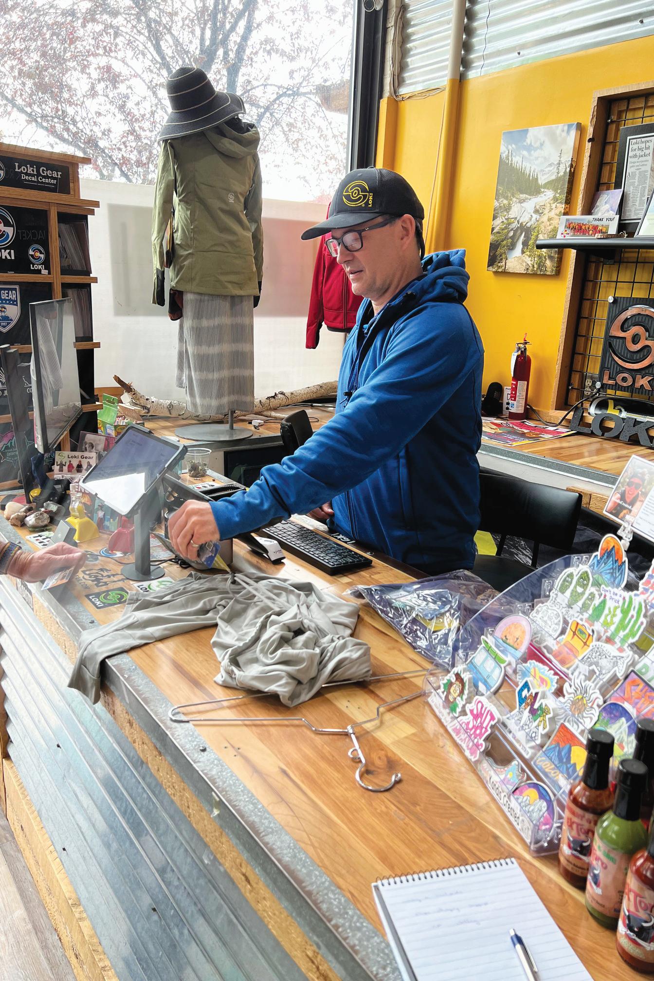ABOVE: Loki Gear owner Seth Anderson stands in front of his store, which moved back to 445 Colorado Ave. after nearly three years on Main Street. Wearing one of the jackets Loki Gear makes and sells, Anderson demonstrates the functionality with the built-in gaiter pulled up to cover his neck and one of the built-in mittens extended from a sleeve. Loki apparel is meant to adapt to changing weather conditions. BELOW: Anderson works the checkout in Loki Gear’s store. Photos by Tim Harty.