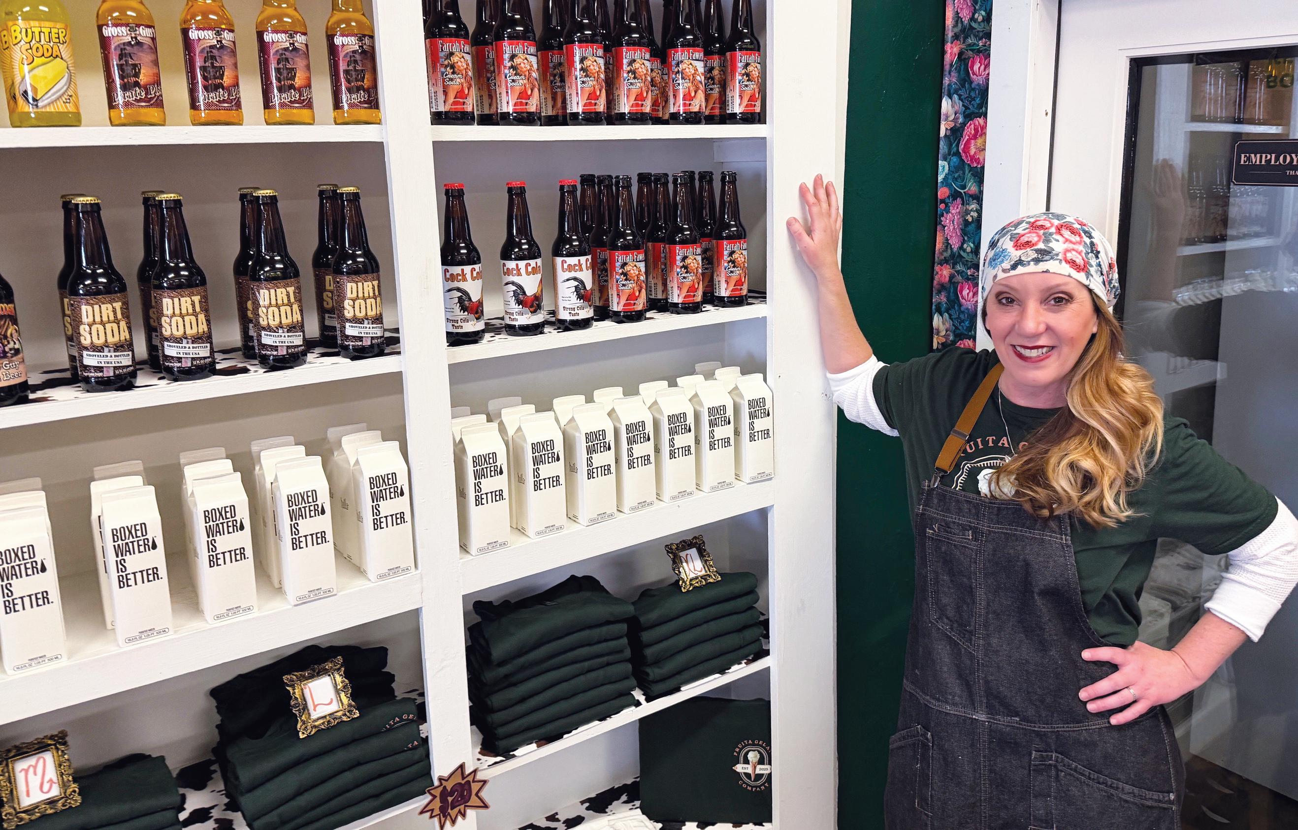 Fruita Gelato Company owner Bridget Legg stands next to shelves that display some of the fun items for sale in her store. She said, “You could buy a Coke and a Sprite and all that kind of stuff at every store in town,” but she wants people to come to her store to get things that aren’t sold everywhere else, “just funny stuff that just makes it a little bit more special and unique.” For instance, Fruita Gelato Company sells: Farrah Fawcett Cream Soda with a label featuring Farrah’s 1976 swimsuit photo that sold more than 12 million posters; Dirt Soda, which claims it’s shoveled and bottled in the U.S.A.; Cobra Kai Black Belt Lemonade; Butter Soda; Bacon Soda; and The Three Stooges Wise Guy Root Beer. Photo by Tim Harty.