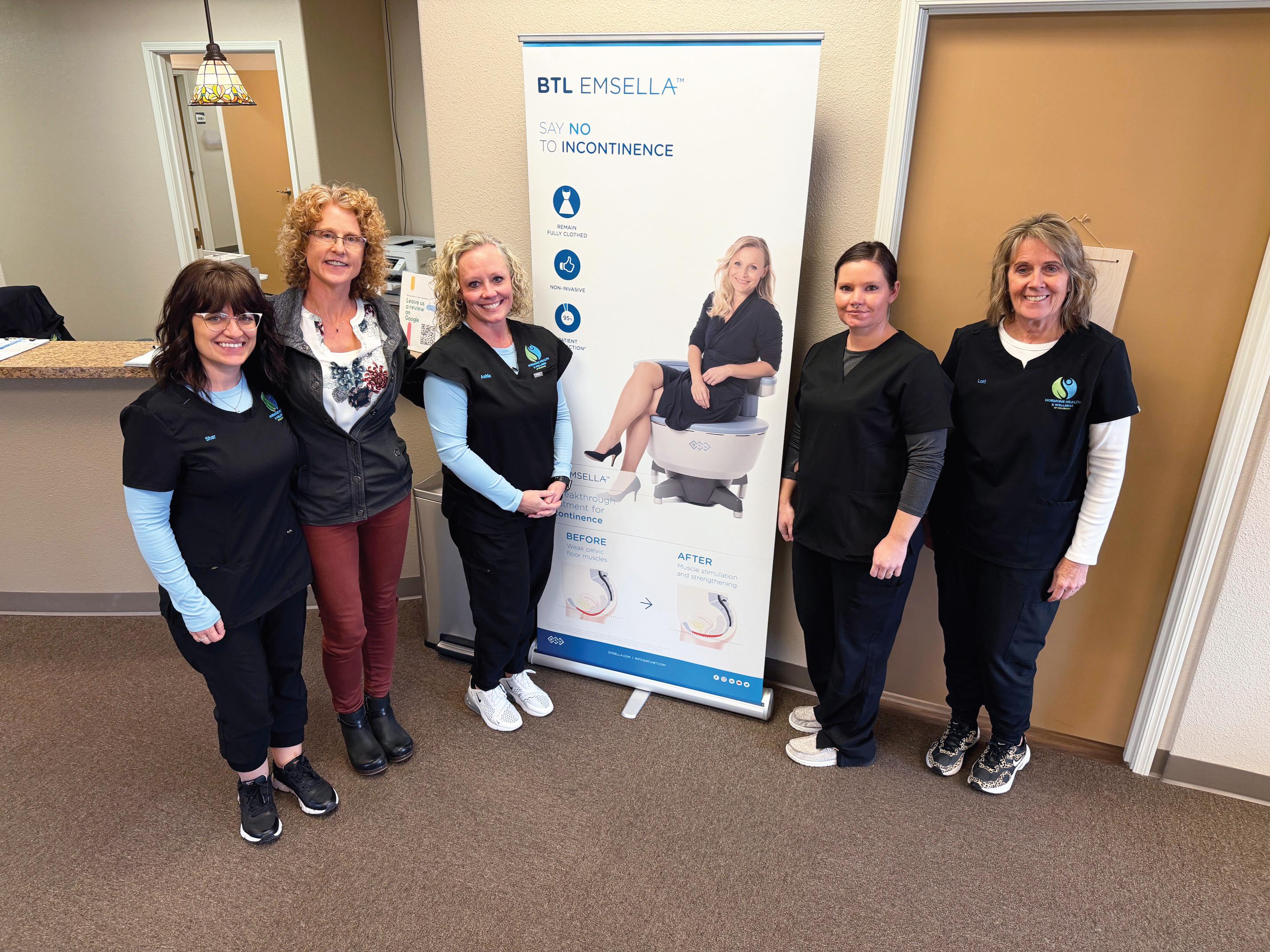 Left to right, Hormone Health & Wellness employees Shardai Salaz, Dr. Kathy Howe, Ashlie Zimmerman, Sherissa Katzenberger and Lori LeFebre stand next to a sign for Emsella, a chair that treats incontinence and is available at Hormone Health & Wellness. Photo by Tim Harty.