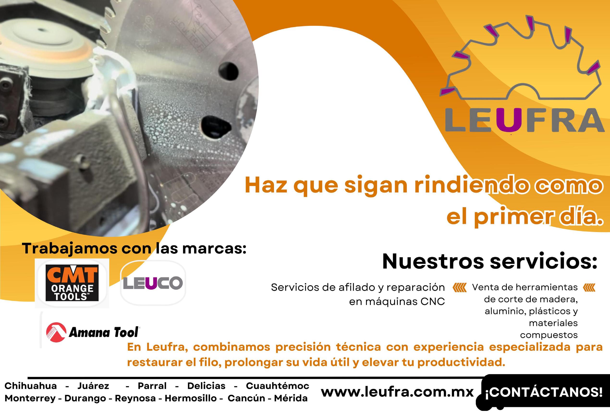 Participante frecuente en las exposiciones de proveeduría para la industria mueblera, como Tecno Mueble Internacional, Leufra, con 25 años de presencia en el mercado, se dedica a la venta de herramientas de corte y maquinaria para trabajar madera, plásticos, aluminio y materiales compuestos. Además ofrece servicios de afilado y reparación en máquinas CNC.
