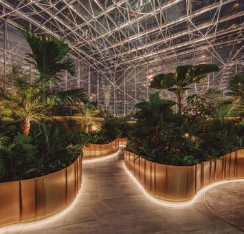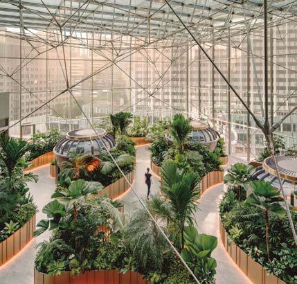 Los arbustos y árboles que habitan dentro del invernadero crecen de manera natural y sostenible como metáfora de los ideales del manejo de riqueza y las raíces de las plantas están contenidas dentro de grandes jardineras que dan forma a pasillos y salas de reuniones y de descanso abiertas.
