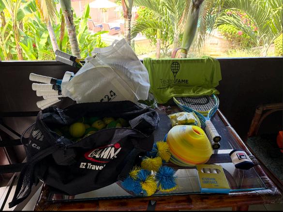 This year, we had over 30 eight- and nine-yearolds playing relays and practicing ball skills under the hot sun, introducing tennis to another group of students. I explained the pen pal project, shared information about tennis and the Team Fame program, and responded to many questions. Additionally, I brought valentines and candy boxes for each Team Fame student, which they thoroughly enjoyed. To further support tennis at their school, I donated more than a dozen racquets, targets, cones, balls, and a teaching bag this year