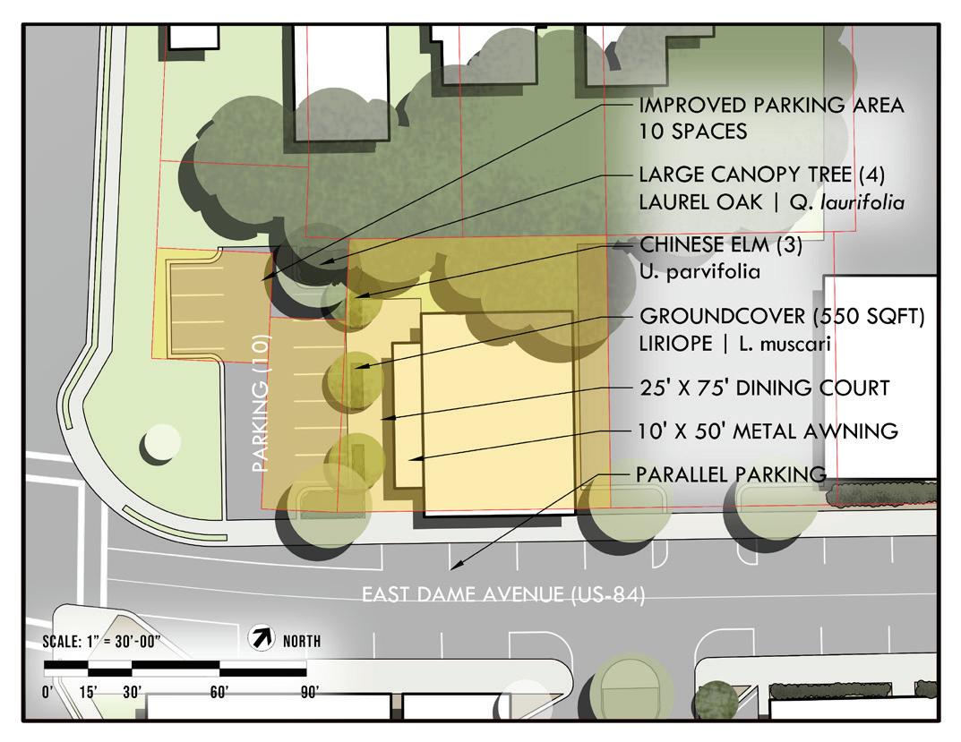 While maintaining the existing one-way pairs of US-84, this concept formalizes existing parallel parking while adding new on-street parking areas with bump-outs and street trees at the Clinch County Courthouse, along Smith Street at the Courthouse Square; on East Dame at the former Blitch Ford lot; and near the depot along South Plant Avenue. This plan includes new pedestrianfriendly event spaces, such as the rear parking area behind Church Street businesses and the proposed Panther Alley on Carswell Street.